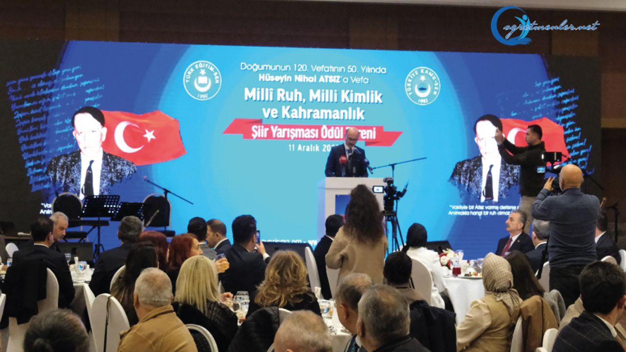 Doğumunun 120. Vefatının 50. Yılında Hüseyin Nihal ATSIZ’a Vefa” temasıyla düzenlediğimiz “Millî Ruh, Millî Kimlik ve Kahramanlık” Şiir Yarışması ödül töreni Ankara’da gerçekleştirildi. Birincilik ödülü; Türk Eğitim Sen Uşak Şubesi’nden Ömerali Şimşek’in “Atsız Ata” isimli eseri İkincilik ödülü; Türk Eğitim Sen Gümüşhane Şube’den Talat Ülker’in “Kızılelma Muştusu” isimli eseri Üçüncülük ödülü Türk Eğitim Sen Gaziantep 1 No’lu Şube’den Abdulhamit Koçoğlu’nun “Hilalin Gölgesinde Atsızlar” isimli eseri Ödül alan ve yarışmaya katılan tüm arkadaşlarımızı kutluyorum. Uzun ve titiz değerlendirmeleriyle yarışmaya katılan eserleri inceleyen kıymetli jüri üyelerimize teşekkür ediyorum. Ayrıca Atsız’ın “Yolların Sonu” şiirini besteleyen ve programımızda verdiği konser ile gönüllerimizi coşturan kıymetli sanatçımız Atilla Yılmaz’a da şükranlarımı sunuyorum.