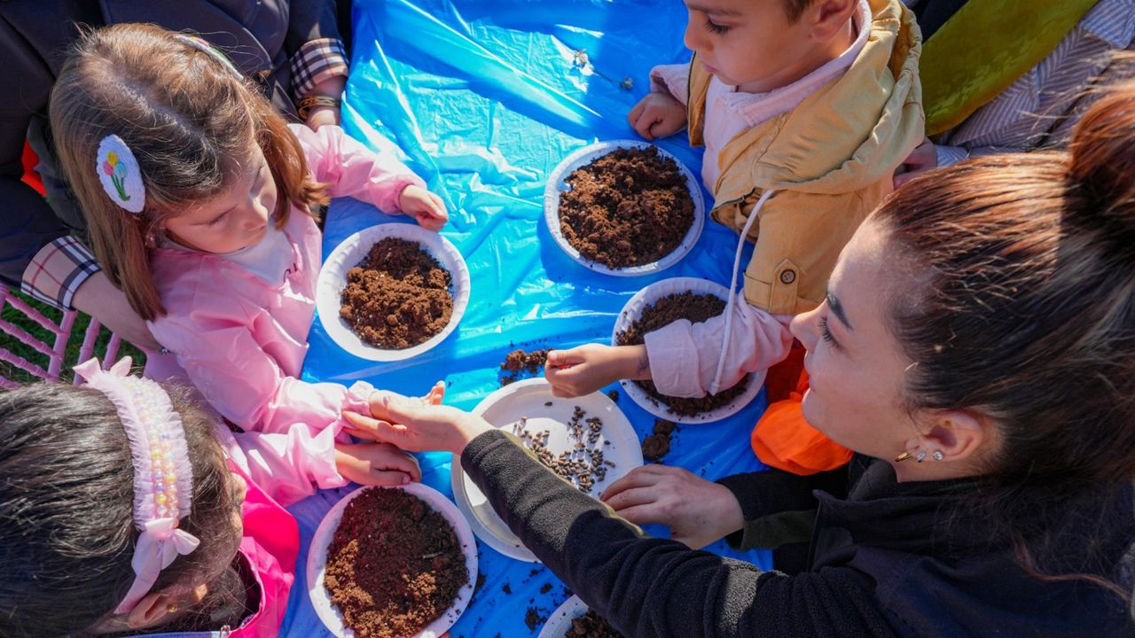 Adalet Anaokulu'nda düzenlenen etkinlikte de öğrenciler ebeveynleri, öğretmenleri ve orman mühendislerinin yardımıyla kazdığı toprağı çamur haline getirip içerisine tohum koydu.