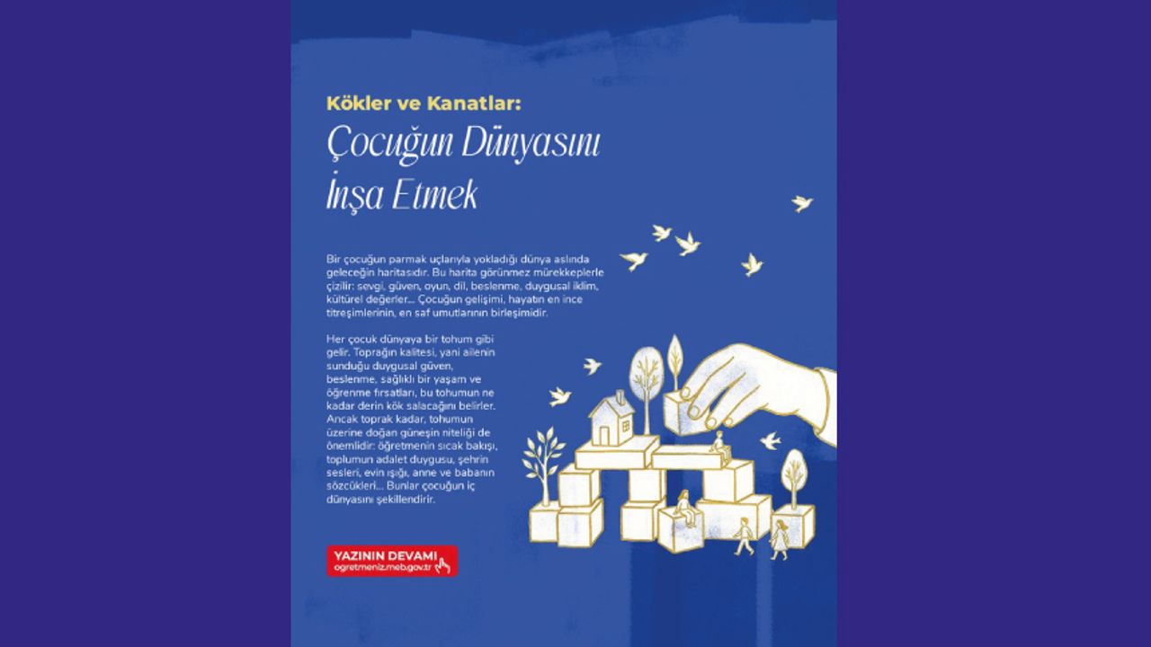 Musa SÜRER’den “Kökler ve Kanatlar: Çocuğun Dünyasını İnşa Etmek” deneme yazısı ÖğretmenİZ dergisinde! Bir çocuğun dünyayı algılayışı, aslında geleceğin sessiz taslağıdır. Sevgiyle derinleşen kökler, adaletle güçlenen bir öğrenme iklimi ve özgürce yükselebilen kanatlar… “Kökler ve Kanatlar: Çocuğun Dünyasını İnşa Etmek”; çocuk gelişimini duygusal güven, dil, oyun, adalet ve kültürel değerler ekseninde ele alan düşünsel derinliği yüksek bir deneme yazısı sunuyor. Yazı; Türkiye Yüzyılı Maarif Modeli perspektifinden, aile-okul-toplum bütünlüğü içinde çocuğun köklerini nasıl sağlamlaştırabileceğimizi ve ona nasıl güvenli kanatlar sunabileceğimizi incelikli bir dil ve güçlü metaforlarla tartışmaya açıyor.