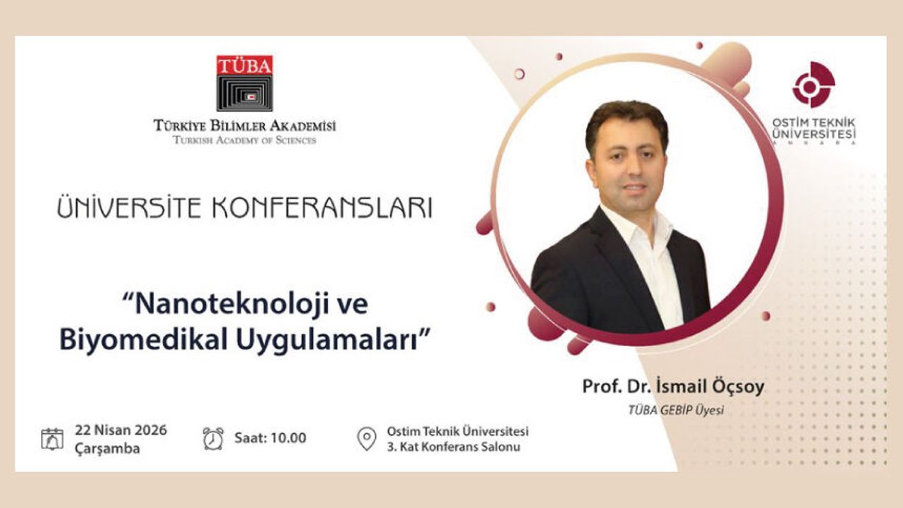 TÜBA GEBİP Üyesi Prof. Dr. İsmail Öçsoy, TÜBA Üniversite Konferansları Programı kapsamında Ostim Teknik Üniversitesi 3. Kat Konferans Salonu’nda 22 Nisan 2026 tarihinde saat 10.00’da "Nanoteknoloji ve Biyomedikal Uygulamaları" konulu bir konferans verecek.