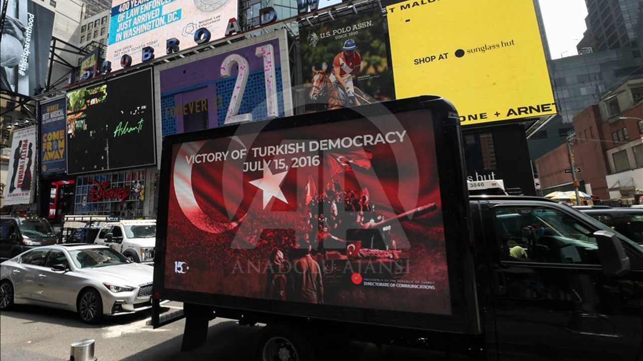 Cumhurbaşkanlığı İletişim Başkanlığımızın koordinasyonunda, 15 Temmuz Demokrasi ve Millî Birlik Günü etkinlikleri kapsamında ABD’nin New York kentinde ve İngiltere’nin başkenti Londra’da, LED ekranlı araçlarla FETÖ’nün 15 Temmuz darbe girişimi ve milletimizin bu hain girişime karşı verdiği mücadele anlatıldı. Kentin önemli noktalarında, milletimizin 15 Temmuz’daki destansı direnişini yansıtan görüntü ve mesajlar LED ekranlarda gösterildi. Zaferin Adı Türkiye