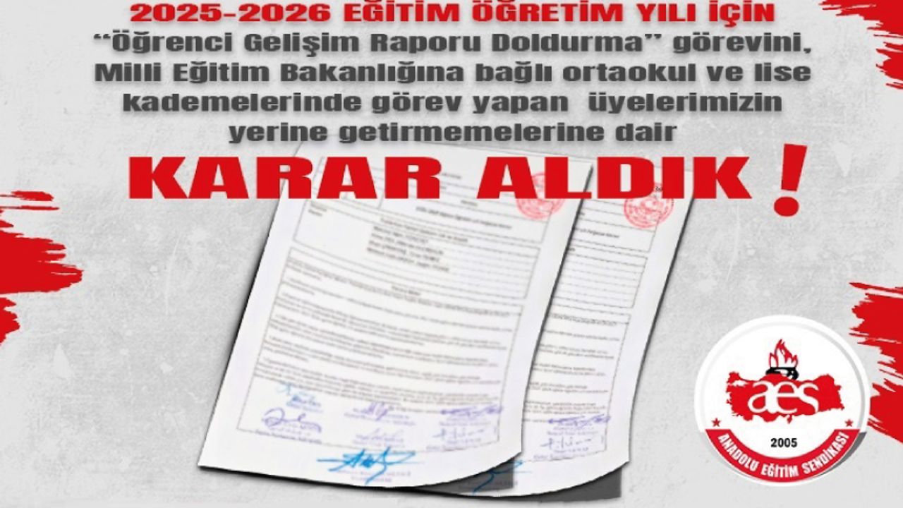 Açıklanan gerekçelerle; Anayasamıza ve mevzu hukuk sistemimize aykırı olan “Öğrenci Gelişim Raporu Doldurma” görevini, Milli Eğitim Bakanlığına bağlı ortaokul ve lise kademelerinde görev yapan üyelerimizin 2025-2026 Eğitim-Öğretim yılı sonuna kadar yerine getirmemelerine karar verilmiştir.