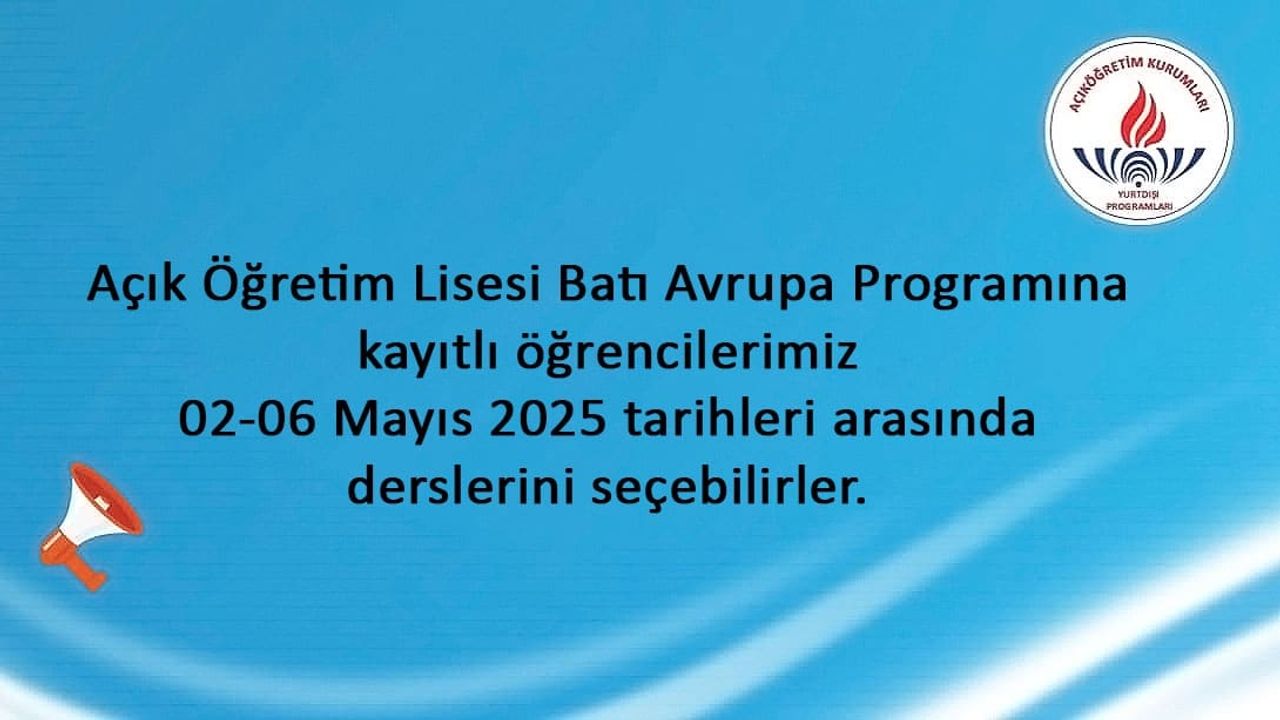 Millî Eğitim Bakanlığı'ndan yapılan açıklamaya göre; Açık Öğretim Lisesi Batı Avrupa Programına kayıtlı öğrencilerimiz 02-06 Mayıs 2025 tarihleri arasında derslerini seçebilirler.