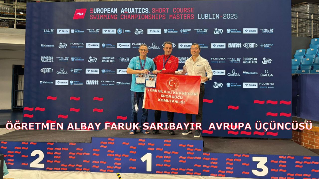 Milli Savunma Üniversitesi Deniz Harp Okulu personeli Öğretmen Albay Faruk Sarıbayır, Avrupa Yüzme Federasyonu tarafından 10-14 Aralık 2025 tarihleri arasında Lublin/Polonya’da düzenlenen “Avrupa Masterlar Kısa Kulvar Yüzme Şampiyonası”na TSK Spor Gücü adına katıldı. Şampiyonada 200 metre kelebek branşında 50-54 yaş erkekler kategorisinde mücadele eden Albay Sarıbayır, Avrupa üçüncülüğü derecesini elde etti ve Türkiye rekorunu kırdı. Sporcumuzu tebrik eder, başarılarının devamını dileriz.