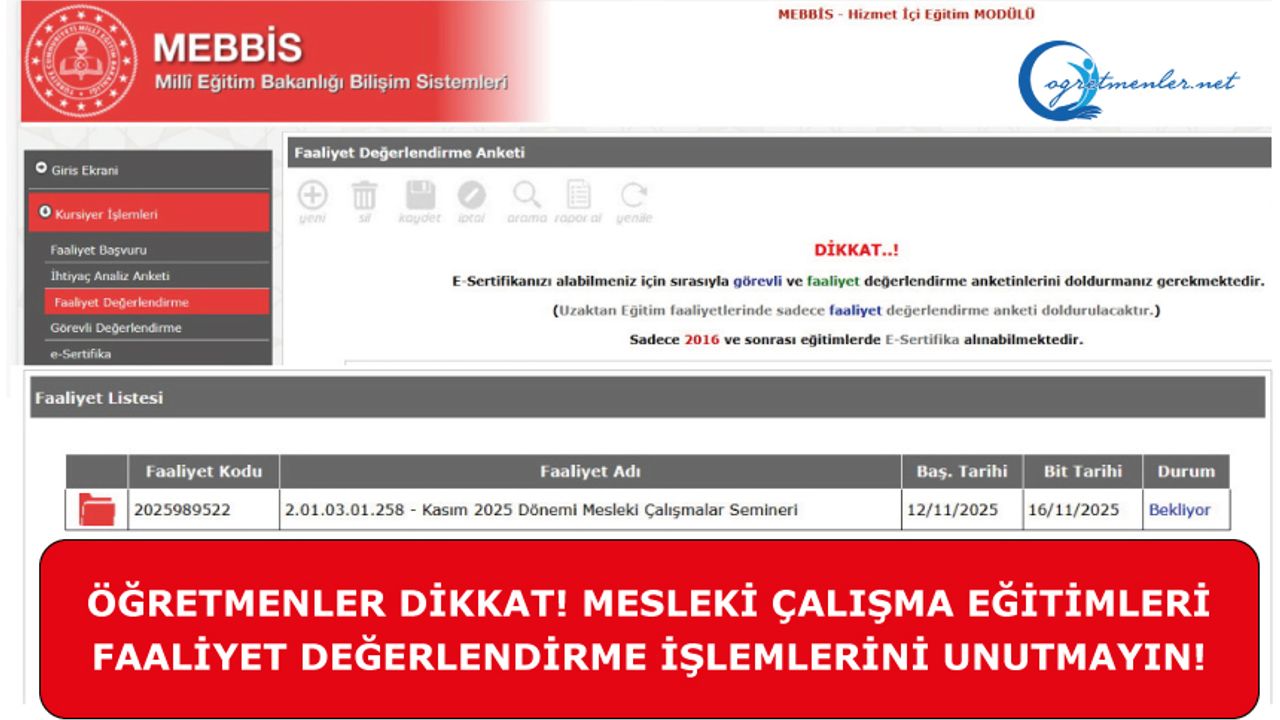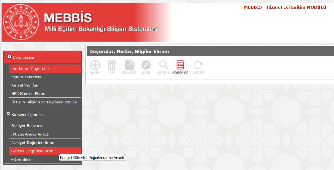 Mebbis > Hizmet İçi Eğitim > Faaliyet Değerlendirme kısmından 1-5 arası not vererek faaliyet değerlendirmesi yapılabilirsiniz.