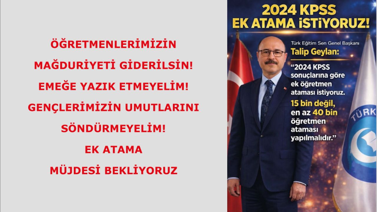 Cumhurbaşkanımız Sayın@RTErdogan; yarınki Kabine toplantısından EK ATAMA müjdesi bekliyoruz. Genç öğretmelerimiz, 2026’ya sevinçle girsinler. Bu haklı beklentiye kayıtsız kalmayacağınıza inanıyoruz. #Kabine2024KPSSEkYirmiBeşBin