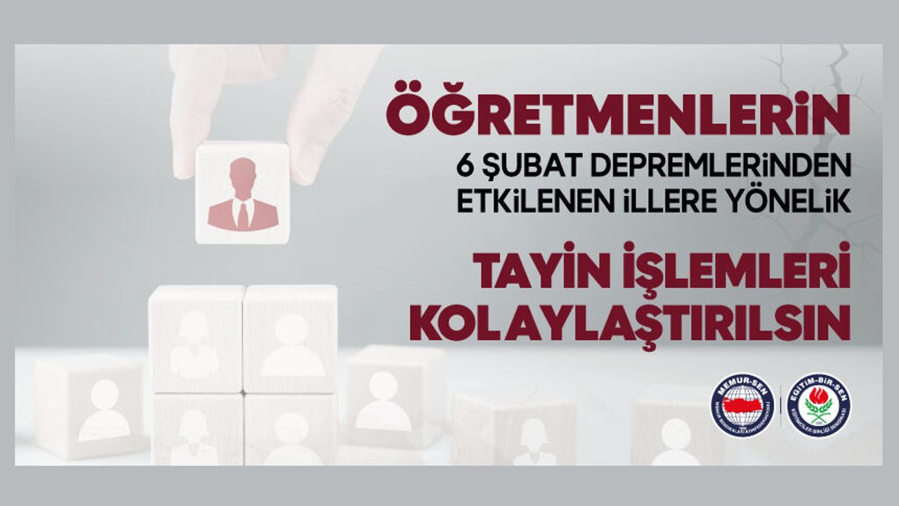 Yaşanmakta olan bu sorunu aşmak için deprem bölgesindeki il ve ilçelere yönelik atanma talepleri ile deprem bölgesinden diğer illere yönelik yer değişikliği taleplerinde öğretmenlere esneklik ve kolaylık sağlayacak yeni bir düzenleme yapılmasını Milli Eğitim Bakanlığından talep ettik.