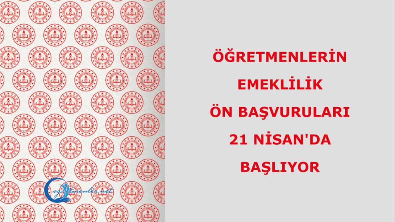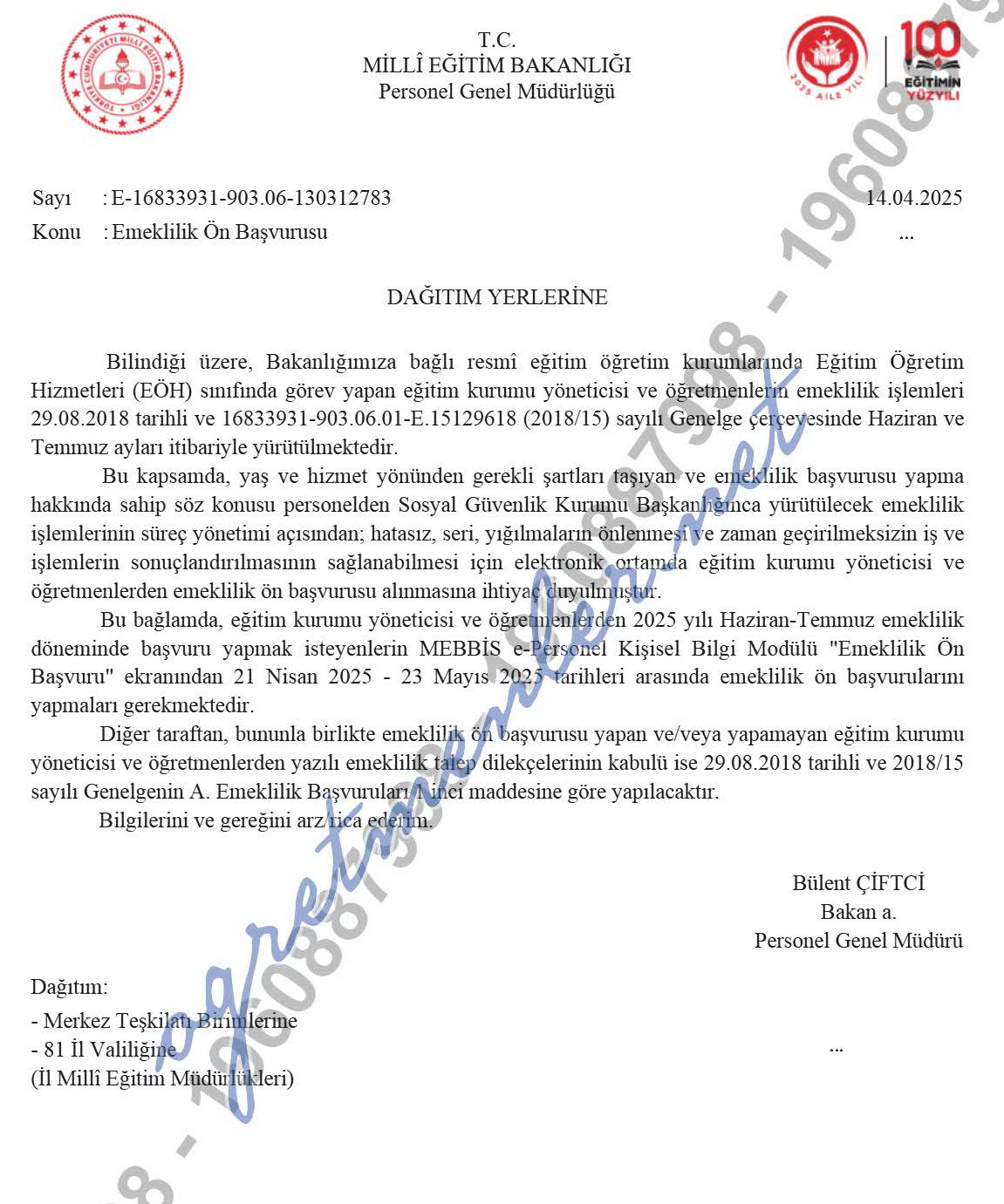 Bu bağlamda, eğitim kurumu yöneticisi ve öğretmenlerden 2025 yılı Haziran-Temmuz emeklilik döneminde başvuru yapmak isteyenlerin MEBBİS e-Personel Kişisel Bilgi Modülü "Emeklilik Ön Başvuru" ekranından 21 Nisan 2025 - 23 Mayıs 2025 tarihleri arasında emeklilik ön başvurularını yapmaları gerekmektedir.