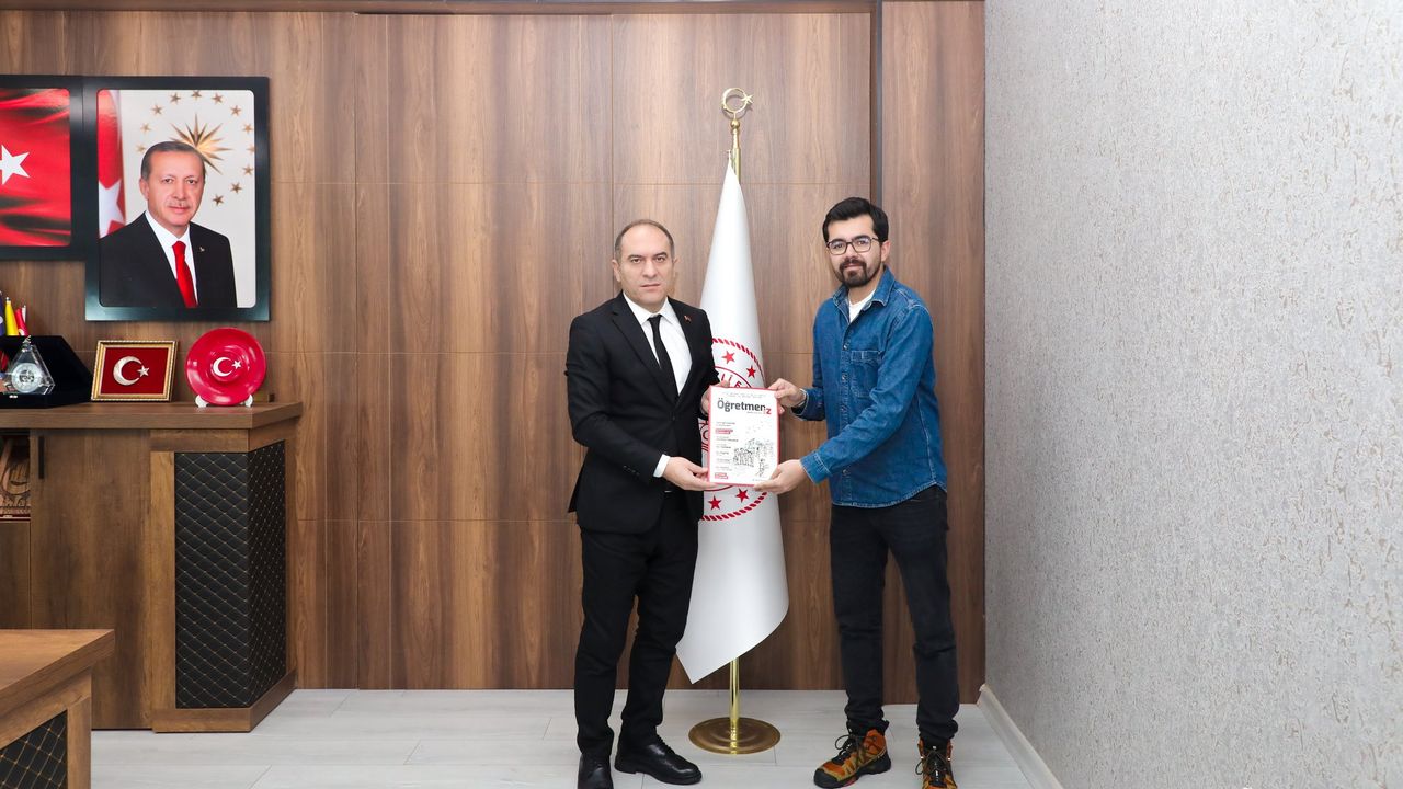 Öğretmenimiz Ökkeş Gül’ün "Uzuntaş Köyünde An" Çalışması ÖğretmenİZ Dergisi’nde Yer Aldı Bitlis İl Millî Eğitim Müdürlüğümüzde görev yapan öğretmenimiz Ökkeş Gül, "Uzuntaş Köyünde An" isimli nitelikli çalışmasıyla ÖğretmenİZ Dergisi’nde yer alarak ilimizi başarıyla temsil etti. Kadim şehir Bitlis’in saklı güzelliklerini ve köy yaşamının samimiyetini geniş bir okur kitlesiyle buluşturan öğretmenimiz, çalışmasıyla büyük beğeni topladı. Milli Eğitim Bakanlığımızca öğretmenlerimize özel baskı olarak hazırlanan dergi, İl Millî Eğitim Müdürümüz Sayın Vedat Kaya tarafından öğretmenimize bizzat takdim edildi. Sayın Kaya, öğretmenimizi başarısından dolayı tebrik ederek; Bitlis’in kültürel mirasını yansıtan bu tür sanatsal çalışmaların eğitim camiası için çok kıymetli olduğunu vurguladı. Öğretmenimizi bu değerli katkısından dolayı kutluyor, başarılarının artarak devam etmesini diliyoruz.