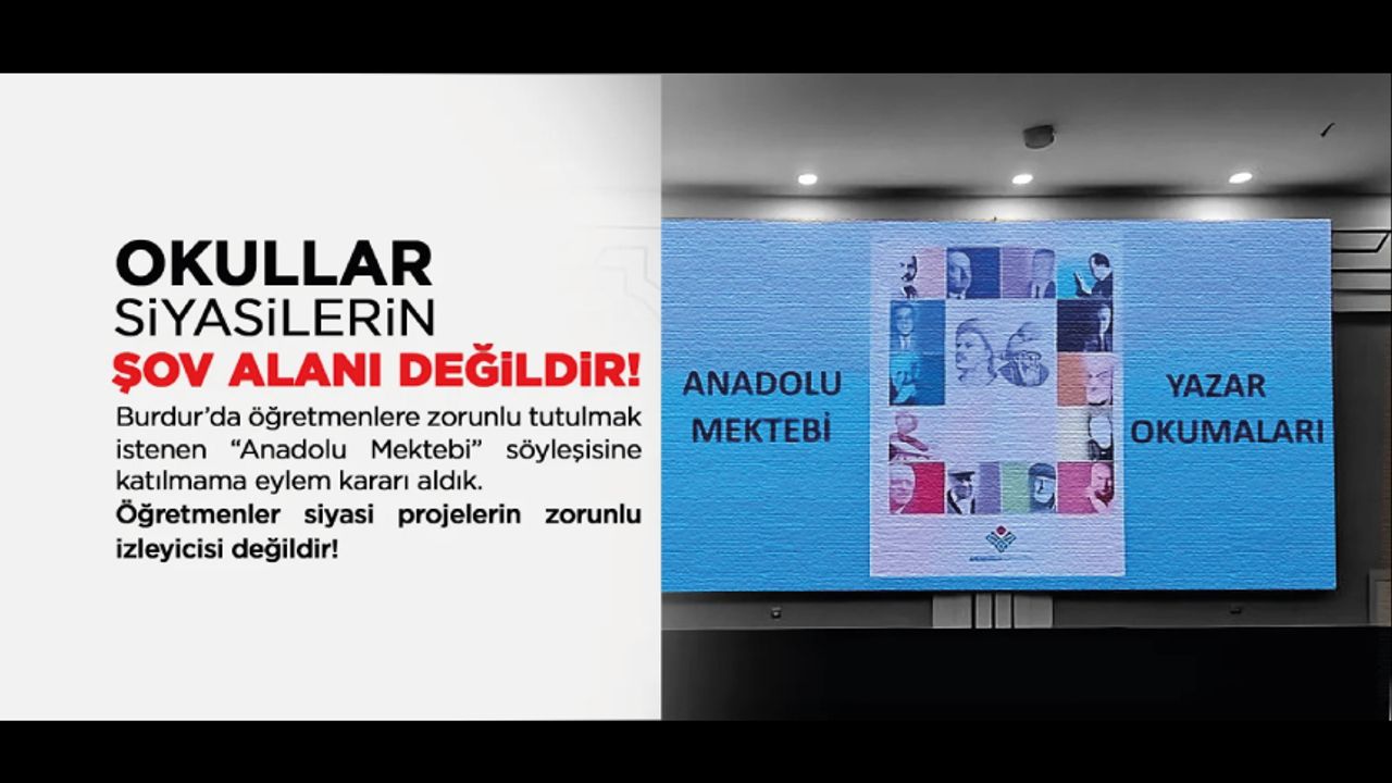 Siyasi iktidar, eğitim üzerindeki ideolojik kuşatmasını; katılımı zorunlu kıldığı projelerle okullara ve öğretmenlere dayatmaya devam etmektedir. İl Milli Eğitim Müdürlüğü tarafından Burdur Valiliği’ne gönderilen yazıda, 15 Ocak 2026 tarihinde gerçekleştirilecek olan “Anadolu Mektebi Yazar Okumaları” kapsamındaki söyleşiye, okul yöneticileri, Türkçe, Türk Dili ve Edebiyat öğretmenlerinin katılımı zorunlu tutulmuştur.