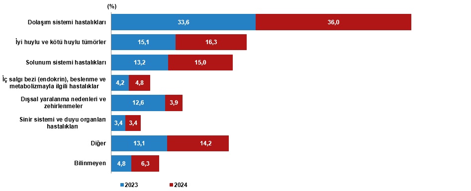 Ölümler nedenlerine göre incelendiğinde, 2024 yılında %36,0 ile dolaşım sistemi hastalıkları ilk sırada yer aldı. Bu ölüm nedenini %16,3 ile iyi huylu ve kötü huylu tümörler, %15,0 ile solunum sistemi hastalıkları izledi.