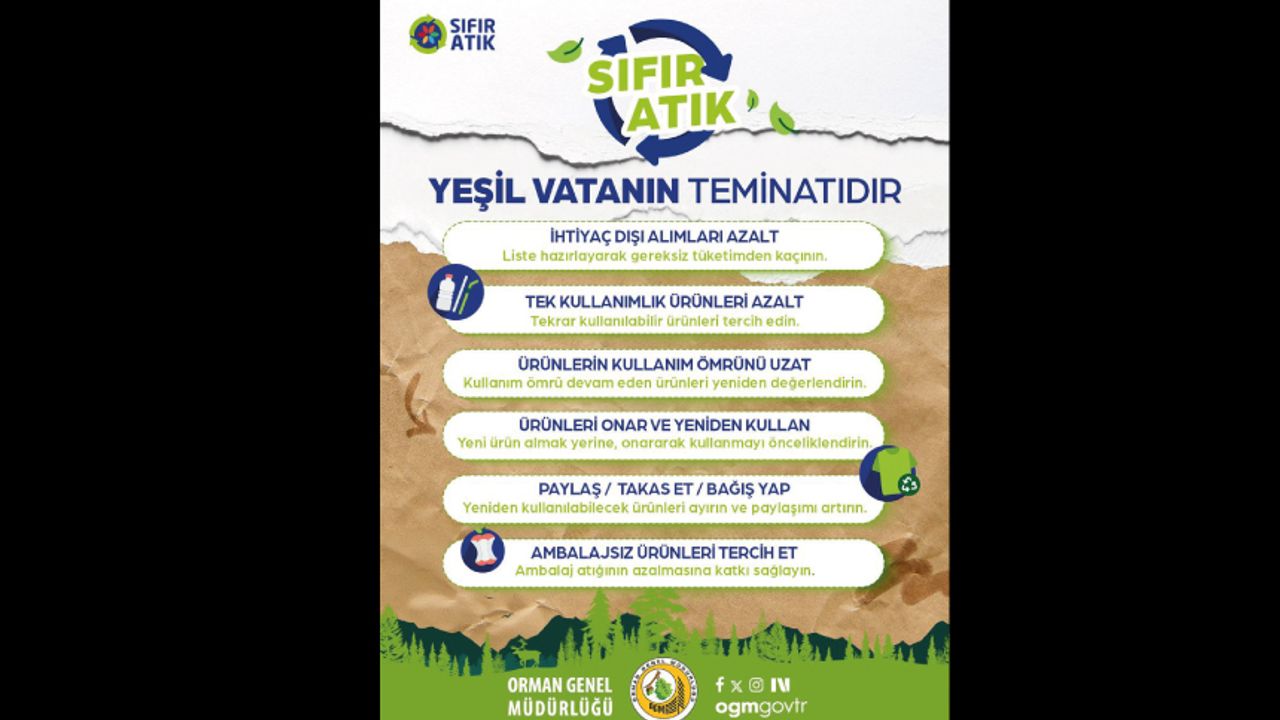 Önle, Azalt, Yeniden Kullan. Doğayı korumanın ilk adımı, tüketim alışkanlıklarımızı değiştirmekten geçiyor. Her onarılan eşya, her paylaşım ve her bilinçli tercih; ormanlarımızın, doğal kaynaklarımızın ve Yeşil Vatan’ın yarınlarına nefes oluyor. #YeşilVatanİçin #SıfırAtık @sifiratikgovtr
