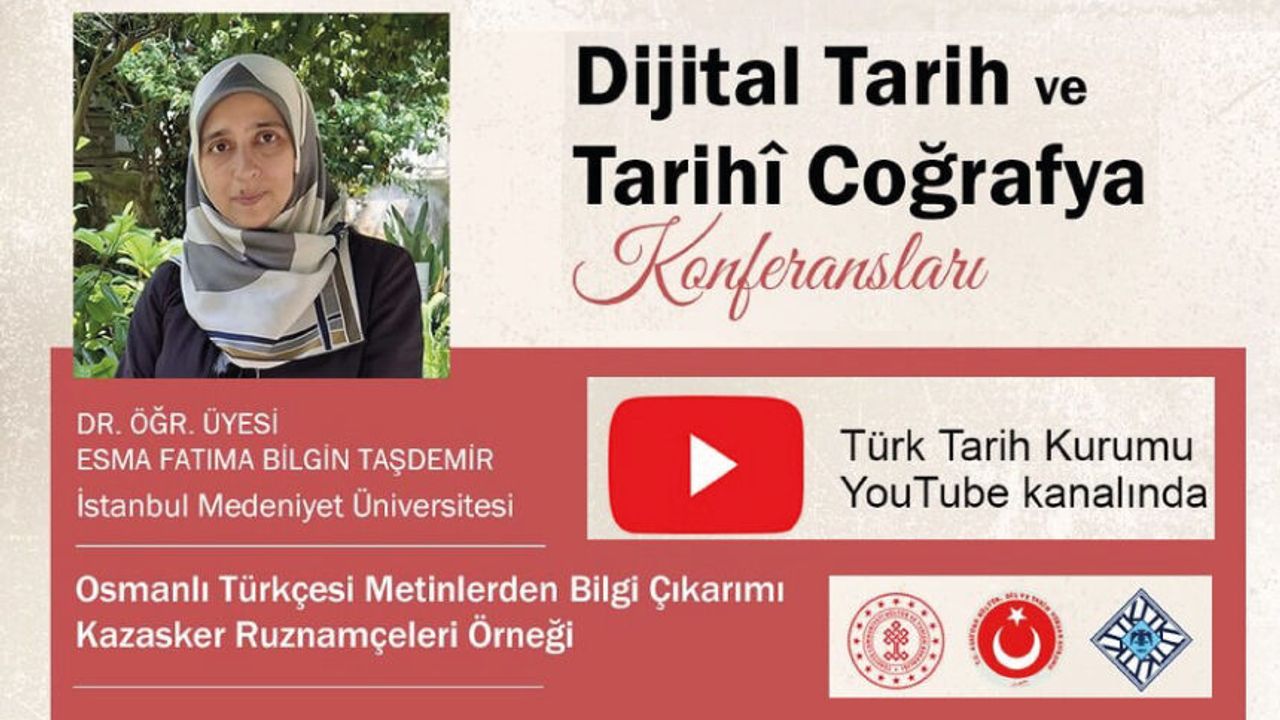 Dijital Tarih ve Tarihî Coğrafya Konferanslarımıza konuk olan Dr. Esma Fatıma Bilgin Taşdemir'in “Osmanlı Türkçesi Metinlerden Bilgi Çıkarımı Kazasker Ruznamçeleri Örneği” başlıklı konferans kaydını Youtube kanalımızda izleyebilirsiniz: