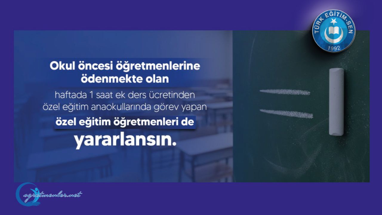 Bu bağlamda, Türk Eğitim Sen olarak ilgi toplu sözleşmenin 39.maddesi gereği okul öncesi öğretmenlerine ödenmekte olan haftada 1 saat ek ders ücretinden özel eğitim anaokullarında görev yapan özel eğitim öğretmenlerinin de yararlandırılması hususunda Milli Eğitim Bakanlığı’na yazılı başvuruda bulunduk.