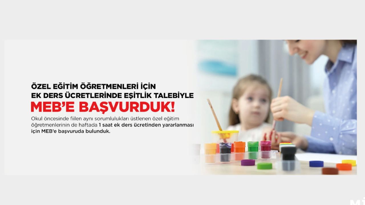 Okul öncesinde fiilen aynı sorumlulukları üstlenen özel eğitim öğretmenlerinin de haftada 1 saat ek ders ücretinden yararlanması için MEB’e başvuruda bulunduk.