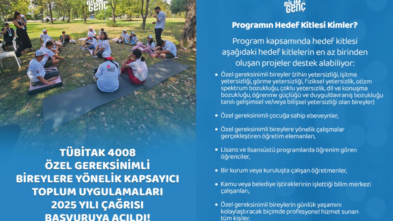 TÜBİTAK Bilim ve Toplum Başkanlığı tarafından yürütülen 4008 Özel Gereksinimli Bireylere Yönelik Kapsayıcı Toplum Uygulamaları çağrısı başvuruya açıldı. Başvurular 5 Ocak 2026 saat 17.30’a kadar http://bilimtoplum-pbs.tubitak.gov.tr adresinden yapılabilir.