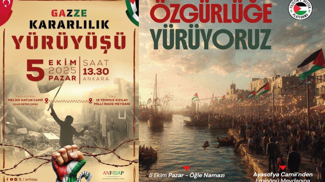“ÖZGÜRLÜĞE YÜRÜYORUZ” Gazze, insanlığın onuru, direnişin ve özgürlüğün sembolüdür. Gazze’nin sesi olmak, özgürlük filolarına omuz vermek ve insanlık onurunu korumak için; başta İstanbul ve Ankara olmak üzere ülkemizin dört bir yerinde bir kez daha meydanlarda olacağız. Tüm milletimizi, vicdan sahibi herkesi; Gazze için, özgürlük için, insanlık için yürüyüşe davet ediyoruz. ANKARA 5 Ekim 2025 Pazar 13.30 Melike Hatun Camii → 15 Temmuz Kızılay Milli İrade Meydanı İSTANBUL 5 Ekim 2025 Pazar Öğle namazı Ayasofya Camii → Eminönü Meydanı
