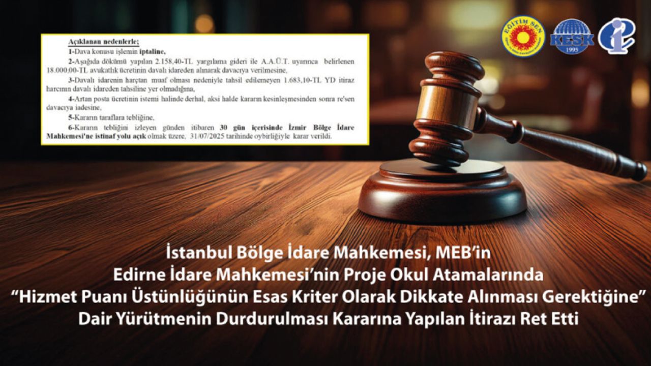 Edirne Mahkemesi’nin “özel program ve proje uygulayan eğitim kurumlarına öğretmen ataması konusunda Bakanın takdir yetkisinin kariyer ve liyakat ilkeleri çerçevesinde, kamu hizmetinin verimliliği, etkinliği ve kamu yararı ile kişi yararı arasında bir denge kurulmak suretiyle objektif şekilde kullanılması gerektiği, olayda özel proje okulu olan Edirne Sosyal Bilimler Lisesi, Edirne Lisesi, Edirne Yıldırım Beyazıt Anadolu Lisesi, Edirne Akmeran Anadolu İmam Hatip Lisesi’ne atamalar yapılırken esas alınan somut ve objektif kriterlerin neler olduğu davalı idarece ortaya konulamadığı, davalı idare tarafından davacının tercihlerine yapılan atamalara ilişkin bilgi belge gönderilmediği, bu durumda söz konusu atamalar yapılırken Milli Eğitim Bakanlığı’nın öğretmenlerin atamalarında ilke olarak aldığı hizmet puanı üstünlüğünün esas kriter olarak dikkate alınması gerektiği halde, hizmet puanı üstünlüğü, kariyer ve liyakat ilkeleri çerçevesinde belirlenecek objektif kriterlere göre değerlendirme yapılmadan, kamu yararı ve hizmet gerekleri gözetilmeden atama işlemlerinin gerçekleştirildiği anlaşıldığından, davacının herhangi bir tercihine yerleşmeyerek 2025 yılı Milli Eğitim Bakanlığına Bağlı Özel Program ve Proje Uygulayan Eğitim Kurumlarına Öğretmen Ataması kapsamında yaptığı tercih sonucunda “tercihlerinizden herhangi birisine atanamadınız” şeklindeki … işlemin hukuka ve mevzuata uyarlık bulunmadığı sonucuna varıldığına dair…” kararına yapılan itirazı İstanbul Bölge İdare Mahkemesi ret etmiştir.