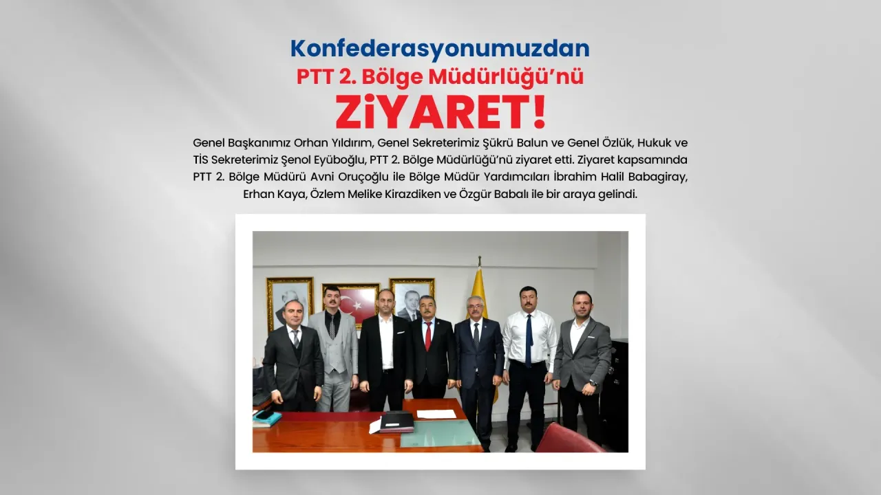 Genel Başkanımız Orhan Yıldırım, Genel Sekreterimiz Şükrü Balun ve Genel Özlük, Hukuk ve TİS Sekreterimiz Şenol Eyüboğlu, PTT 2. Bölge Müdürlüğü’nü ziyaret etti. Ziyaret kapsamında PTT 2. Bölge Müdürü Avni Oruçoğlu ile Bölge Müdür Yardımcıları İbrahim Halil Babagiray, Erhan Kaya, Özlem Melike Kirazdiken ve Özgür Babalı ile bir araya gelindi.