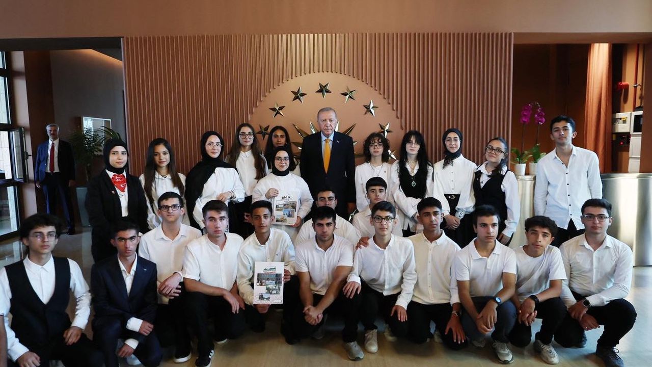 Millî Eğitim Bakanı Yusuf Tekin'in de bulunduğu kabulde, Erdoğan öğrencilerle sohbet etti ve hatıra fotoğrafı çektirdi.