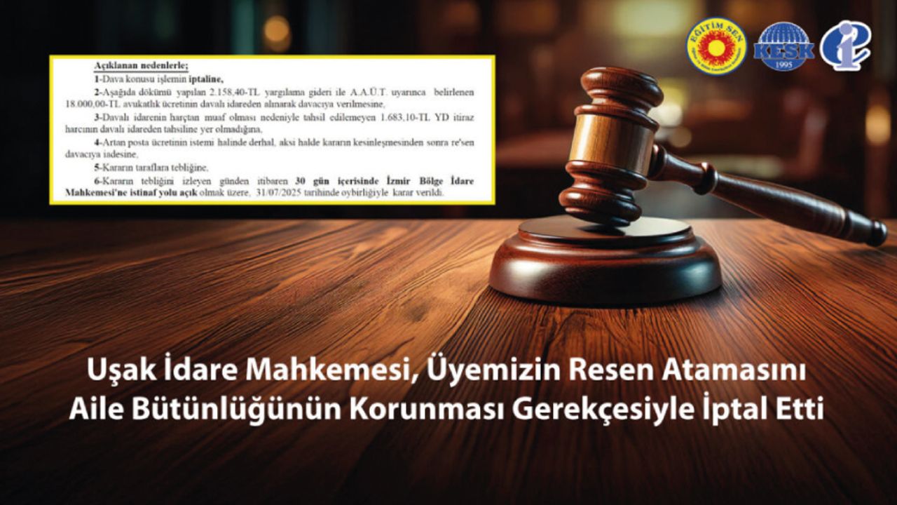 Uşak İdare Mahkemesi, Eğitim Sen üyesi öğretmenin, davalı idare tarafından norm kadro fazlası olarak belirlenerek resen atanmasına ilişkin işlemi hakkında, aile bütünlüğünün korunması gerekçesiyle iptal karar verdi.