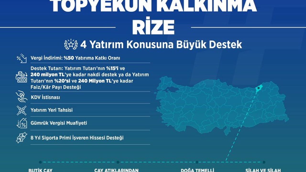 Rize, çaydan turizme, savunmadan çevreye her alanda yükseliyor! #YerelKalkınmaHamlesi Teşvik Programı ile Rize'de destekleyeceğimiz projeler Butik Çay Turizm Kompleksi Çay Atıklarından Aktif Karbon Üretimi Doğa Temelli Turizm Merkezi Silah ve Silah Parçaları Üretimi Rize’nin üretim gücünü ve turizm potansiyelini artırarak #TürkiyeYüzyılı yolculuğuna katkı sunuyoruz.