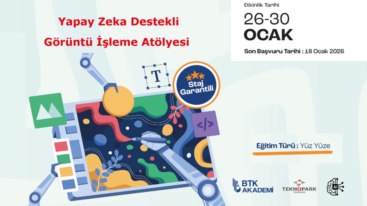 iş birliğiyle düzenlenen Yapay Zekâ Destekli Görüntü İşleme Atölyesi seni bekliyor. Yapay zekâ ve görüntü işleme alanında kendini geliştirmek, uygulamalı bir atölye deneyimi yaşamak istiyorsan bu fırsatı kaçırma! Son başvuru: 18 Ocak 2026
