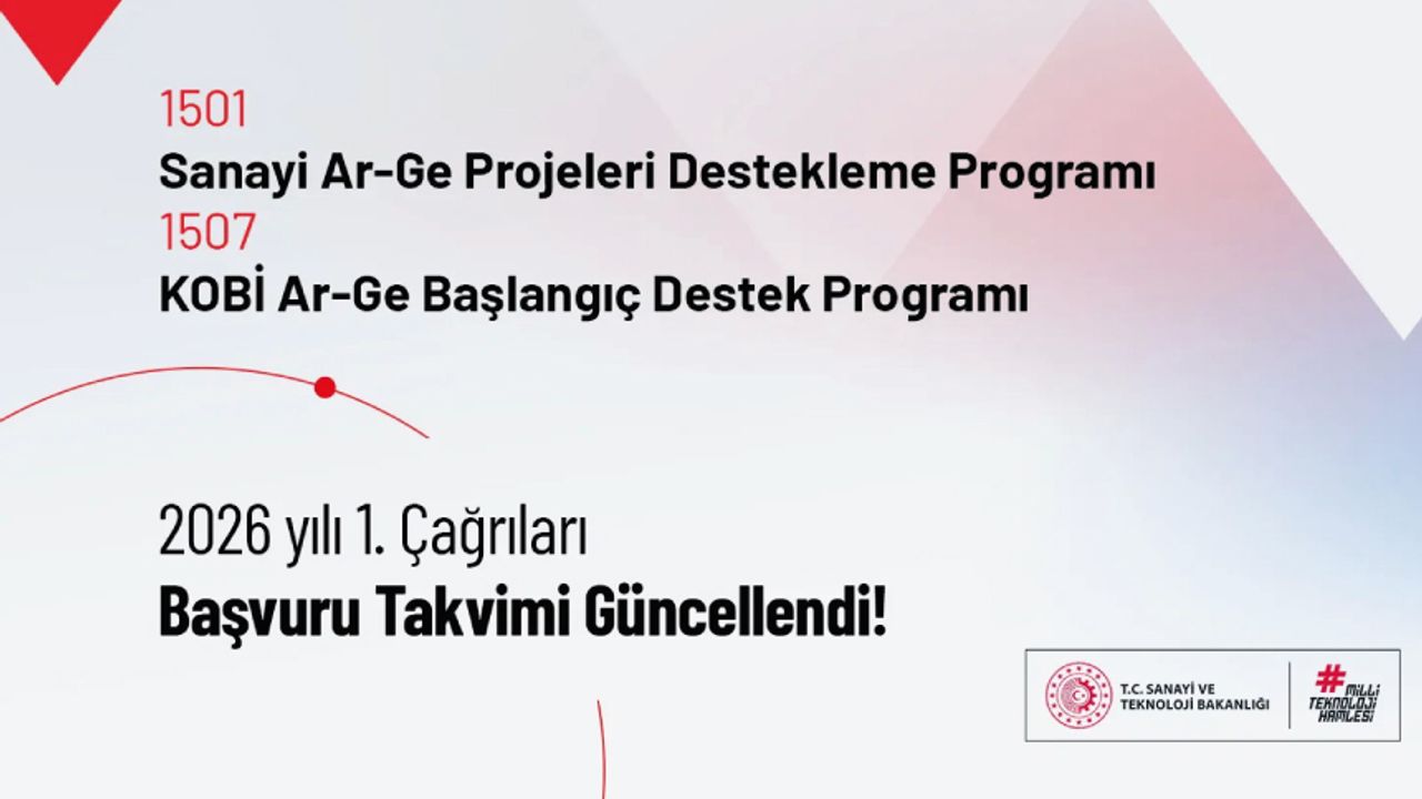 Küçük ve Orta Büyüklükteki İşletmeler (KOBİ) ölçeğindeki kuruluşların başvuru yapabilecekleri 1501-Sanayi Ar-Ge Destek Programı ve 1507-KOBİ Ar-Ge Başlangıç Destek Programı 2026 yılı 1. Çağrıları için başvuru takvimi güncellenmiştir.