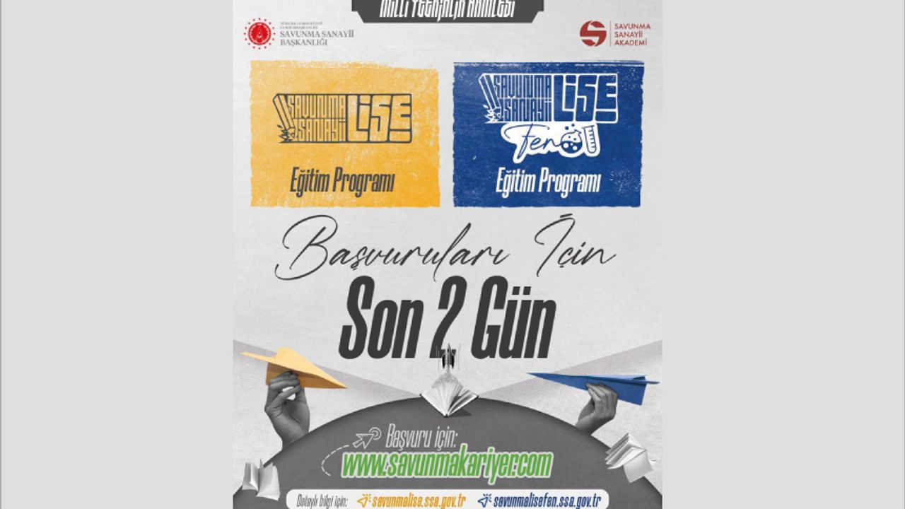 Savunma Sanayii Lise ve Savunma Sanayii Lise Fen Eğitim Programı Başvuruları İçin Son 2 Gün Başvuru için: http://savunmakariyer.com Detaylı bilgi için: http://savunmalise.ssa.gov.tr http://savunmalisefen.ssa.gov.tr #MilliYetkinlikHamlesi #SavunmaSanayiiLise #SavunmaSanayiiLiseFen