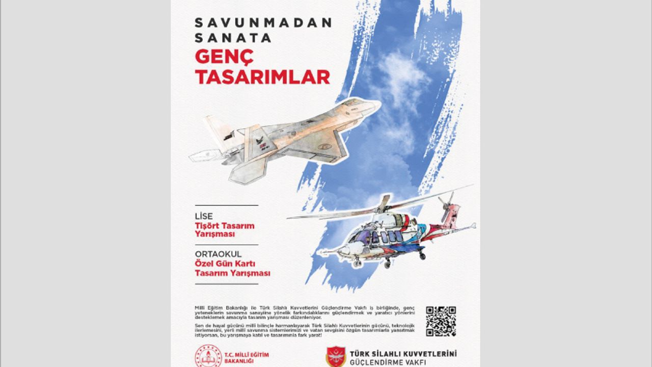 Millî Eğitim Bakanlığı ile Türk Silahlı Kuvvetlerini Güçlendirme Vakfı iş birliğinde gençlerin millî ve manevi değerlere duyarlığını artırmak, yerli savunma sanayisine yönelik farkındalıklarını güçlendirmek ve sanatsal yaratıcılıklarını desteklemek amacıyla düzenlenen yarışmada öğrencilerimiz; “Özel gün kartı” ve “tişört" tasarımı kategorilerinde yarışacak. Çeşitli ödüllerin verileceği yarışmada toplamda 492 tasarım ödüllendirilecek. Son Başvuru: 12 Aralık 2025 https://meb.ai/U88ANtk#SavunmadanSanata#GençTasarımlar#MilliTeknoloji#TasarımYarışması