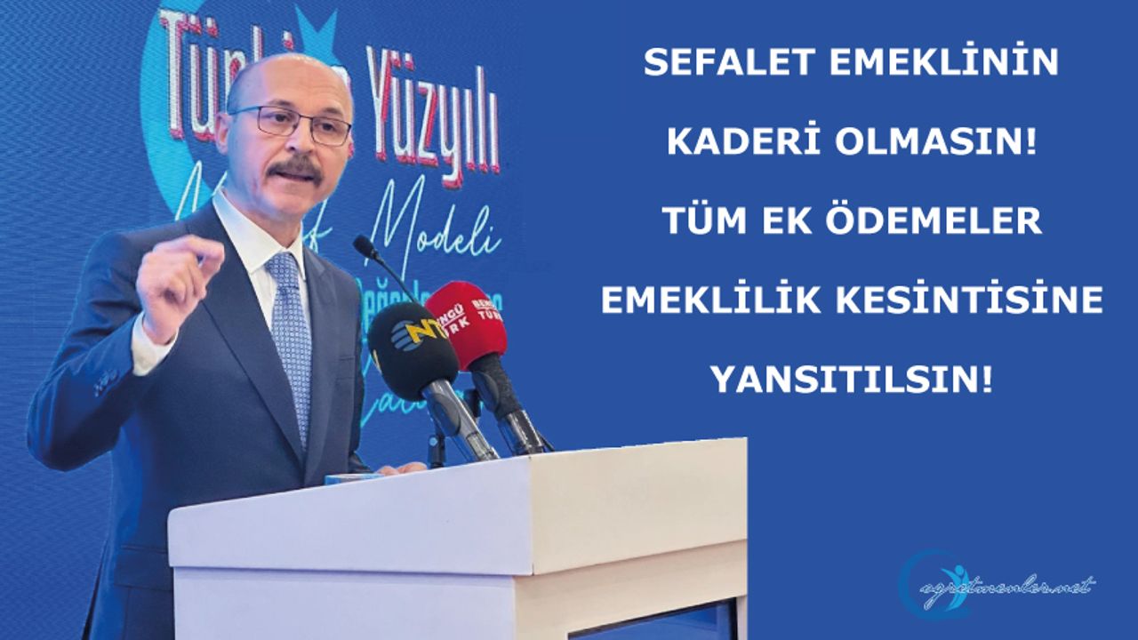 - Tüm ilave ödemeler emeklilik kesintisine dahil edilmelidir. Bir kamu çalışanı şu an emekli olduğunda, çalışırken aldığı maaşın en fazla yüzde 45’ini alıyor. Bu durum ciddi bir gelir kaybıdır. Sefalet emeklinin kaderi olmasın! Bu itibarla Türkiye Kamu Sen diyor ki; tüm yan ödemeler emeklilik kesintisine dahil edilsin, emekli maaşı ikramiyesinde de kayda değer artış olsun.