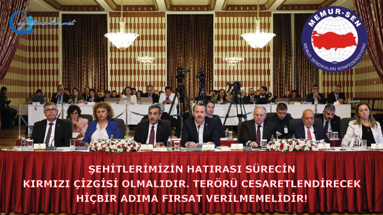 Komisyonda bir konuşma gerçekleştiren Genel Başkan Yalçın, terörün, kendileri için sadece güvenliği değil, aynı zamanda toplumun sosyal barışını, kamu hizmetlerini, çalışma hayatını hedef alan büyük bir tehdit ve en önemlisi insanlığa karşı işlenmiş bir suç olduğunu belirtti. Ali Yalçın, bu nedenle kimden gelirse gelsin, hangi gerekçeye dayandırılırsa dayandırılsın, teröre asla meşruiyet kazandırılamayacağının altını çizdi.