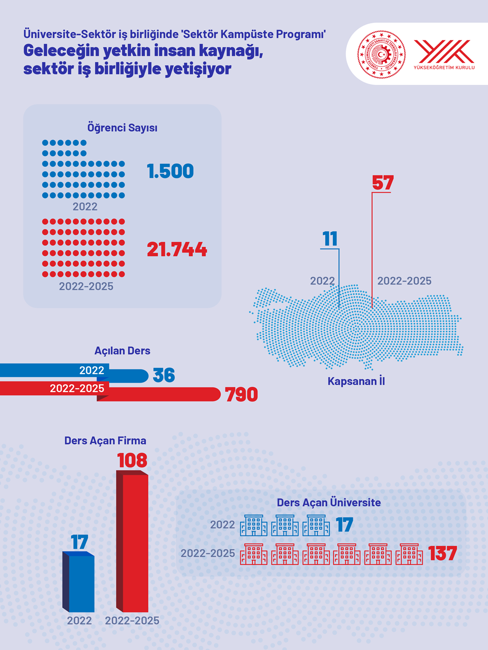 2022-2023 Akademik Yılı Bahar Dönemi’nde 11 ilde 17 üniversiteyle başlatılan program, 3 yıl içinde 57 ile ve 137 farklı üniversiteye ulaştı. 108 firma tarafından açılan 790 dersle 22 bin öğrenciye ulaşan program, ülke genelinde yaygın şekilde uygulanmaya devam ediyor.