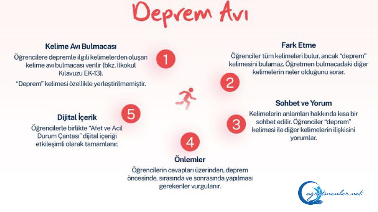 Sevgili öğretmenlerimiz, 10.10.2025 Cuma gününün etkinliği: “*Deprem Avı*” Yeşil Vatan – Benim Okulum Geleceğe ÇARE etkinlikleri kapsamında ilkokul öğrencileri için hazırladığımız bu etkinlikte; çocuklarımız depremle ilgili temel kavramları bir kelime bulmacasıyla öğreniyorlar, afet bilinci kazanıyorlar. ÇARE – Çevre ve İklim Okuryazarlığı Etkinlikleri Öğretmen Kılavuzu’nda yer alan etkinliğin detaylarına ve daha fazlasına ulaşmak için; http://meb.ai/bHopxd Etkinliği uyguladıktan sonra çalışmalarınızı #AfetlerveDayanıklılıkAyı ve #BenimOkulumGeleceğeÇARE etiketleriyle paylaşabilirsiniz.