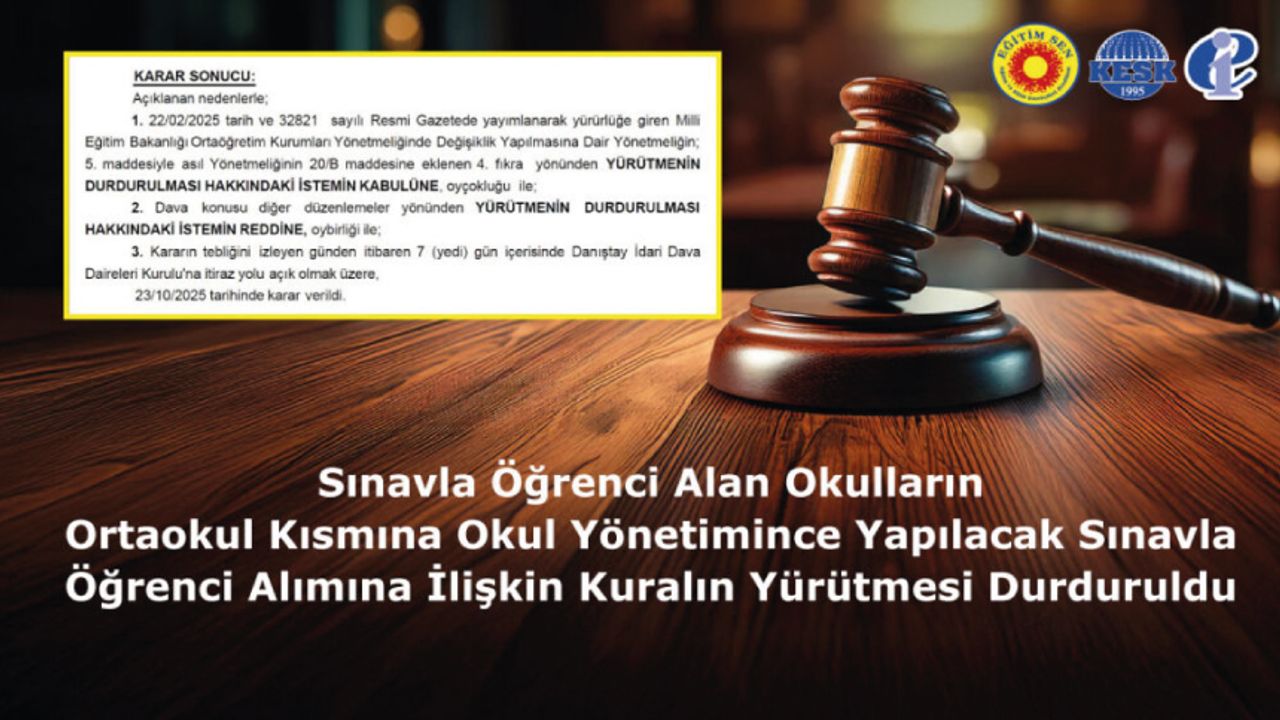 22.02.2025 tarih ve 32821 sayılı Resmi Gazete’de yayımlanarak yürürlüğe giren Milli Eğitim Bakanlığı Ortaöğretim Kurumları Yönetmeliğinde Değişiklik Yapılmasına Dair Yönetmeliğin bazı düzenlemelerinin iptali istemi ile açılan davada, Danıştay 8. Daire, asıl yönetmeliğin 20/B maddesine eklenen 4. fıkranın yürütmesinin durdurulmasına karar verilmiştir. Yürütmesi durdurulan düzenleme; bünyesinde ortaokul bulunan, merkezi sınav puanıyla öğrenci alan okulların ortaokul kısmına öğrenci alımının, okul yönetimince yapılacak yazılı ve/veya sözlü sınav sonucuna göre de yapılabileceği kuralına ilişkindir.