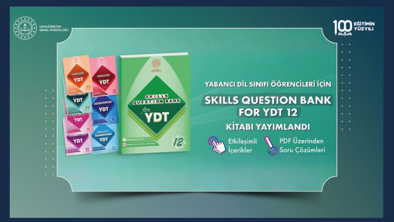 YDT'de ölçülen temel yeterlilikler arasında okuduğunu anlama, bağlamdan çıkarım yapma, çeviri becerileri ve farklı soru türlerine yönelik stratejik yaklaşım geliştirme yer almaktadır. Bu nedenle Genel Müdürlüğümüz, öğrencilerin akademik başarılarını artırmak ve YDT'ye daha etkin bir şekilde hazırlanmalarını desteklemek amacı ile yeni bir yardımcı kaynak olan "Skills Question Bank for YDT Grade 12" kitabını yayımladı. Yayımlanan kitap ile birlikte bu kaynak seti tamamlayıcı ve bütüncül bir yapıya kavuşmuş oluyor.