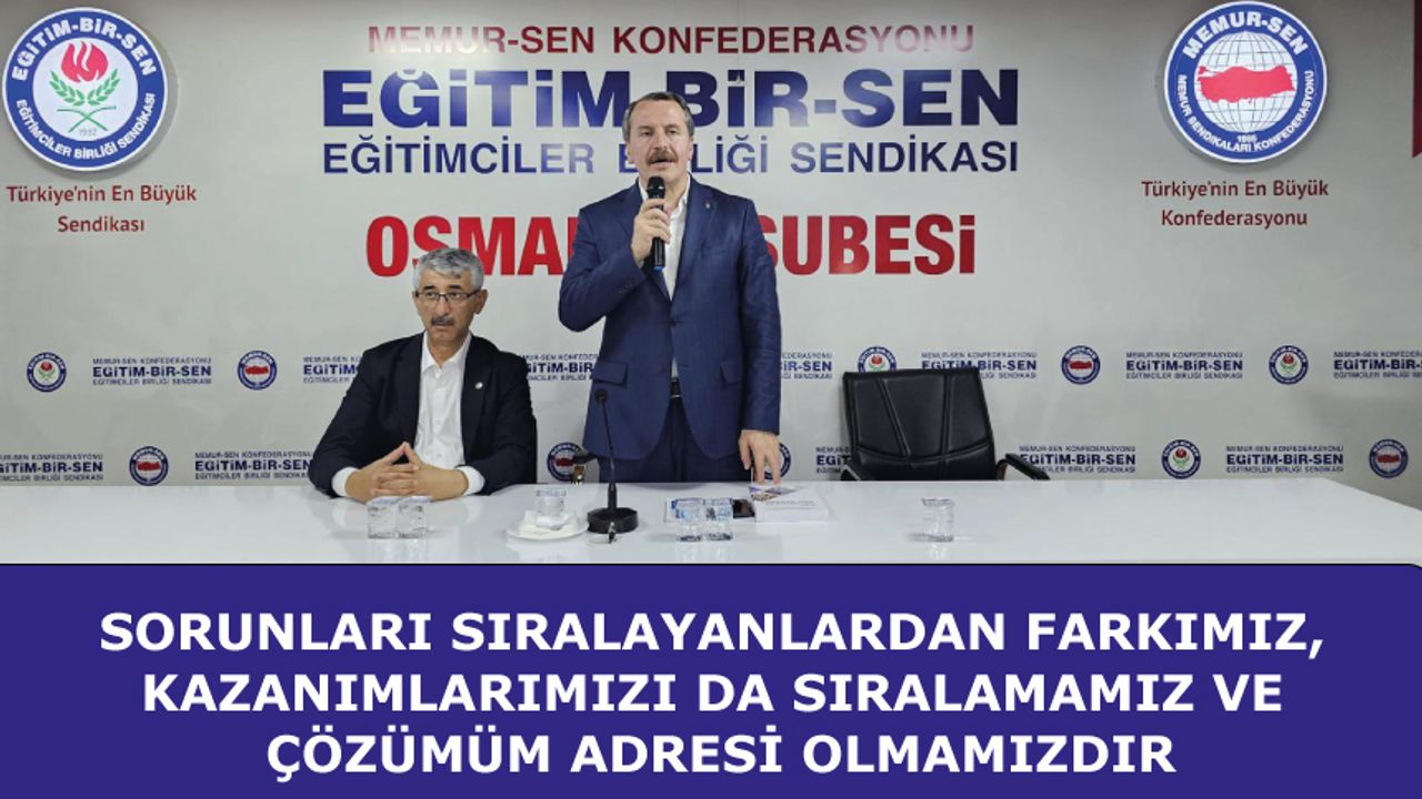 Ülkemizde sendikacılık, sorunları sıralamak ve oluşan öfke köpüğü üzerinde sörf yapmak olarak kanıksandığı için genel arizi bir uygulamaya dönüşmüştür. Sendika ağlama duvarı değil, sendikacılık ise sorunları alt alta sıralama değildir. İtirazlarınızın nedeni, önermelerinizin temeli olmalı. Memur-Sen sadece sorunları sıralamanın değil aynı zamanda çözümleri konuşmanın ve kazanıma ulaşmanın adresidir. Biz erdemli sendikal hareket olarak; söylenmeyi değil söylemeyi seçtik. Kolay olana sapmadık, doğru olanı yaptık. Eğitim-Bir-Sen olarak Türkiye’nin en büyük sendikası olmamız tesadüf değildir. Herkes konuşur ama “Eğitim-Bir-Sen bu konuda ne diyor” diye sorulur. Bu bir akademi gibi çalışmamızın, ter akıtmamızın, güveni esas almamızın; “kavga zemininde rekabet değil, rekabet zemininde akademik hizmet sendikacılığı” yapmamızın eseridir. Sendikacılığı; ucuz işlerin değil, gelecek günlerin, kalıcı iş ve eylemlerin adresi olarak kodlamamızın semeresidir başarımız. Salt sorunları sıralamayı değil çözümlerimizi ve kazanımlarımızı sıralamayı sürdüreceğiz.