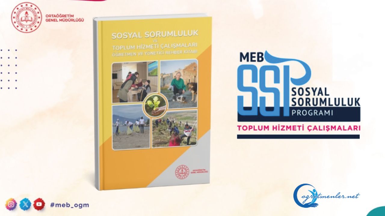Bakanlığımızca 2024 yılında yürürlüğe konulan "Sosyal Sorumluluk Programı ve Hayat Boyu Öğrenme/Sertifikasyon Uygulama Yönergesi" ile birlikte, 2024-2025 eğitim ve öğretim yılında hayata geçirilen "Okul Öğrenci Kulüpleri Sosyal Sorumluluk Programı ve Toplum Hizmeti Çalışmaları Uygulama Projesi" kapsamında sosyal sorumluluk faaliyetlerinde rehberlik sağlamak amacıyla kullanılan "Sosyal Sorumluluk ve Toplum Hizmeti Çalışmaları Öğretmen ve Yönetici Rehber Kitabı", öğretmenler ve okul yöneticilerine yol göstermeye devam ediyor.