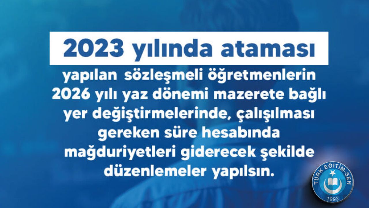 Bu bağlamda, Türk Eğitim Sen olarak, 2026 yılı yaz dönemi mazerete bağlı yer değiştirmelerde, çalışılması gereken süre hesabında mağduriyetleri giderecek şekilde gerekli düzenlemelerin yapılması hususunda Milli Eğitim Bakanlığı’na yazılı talepte bulunduk.