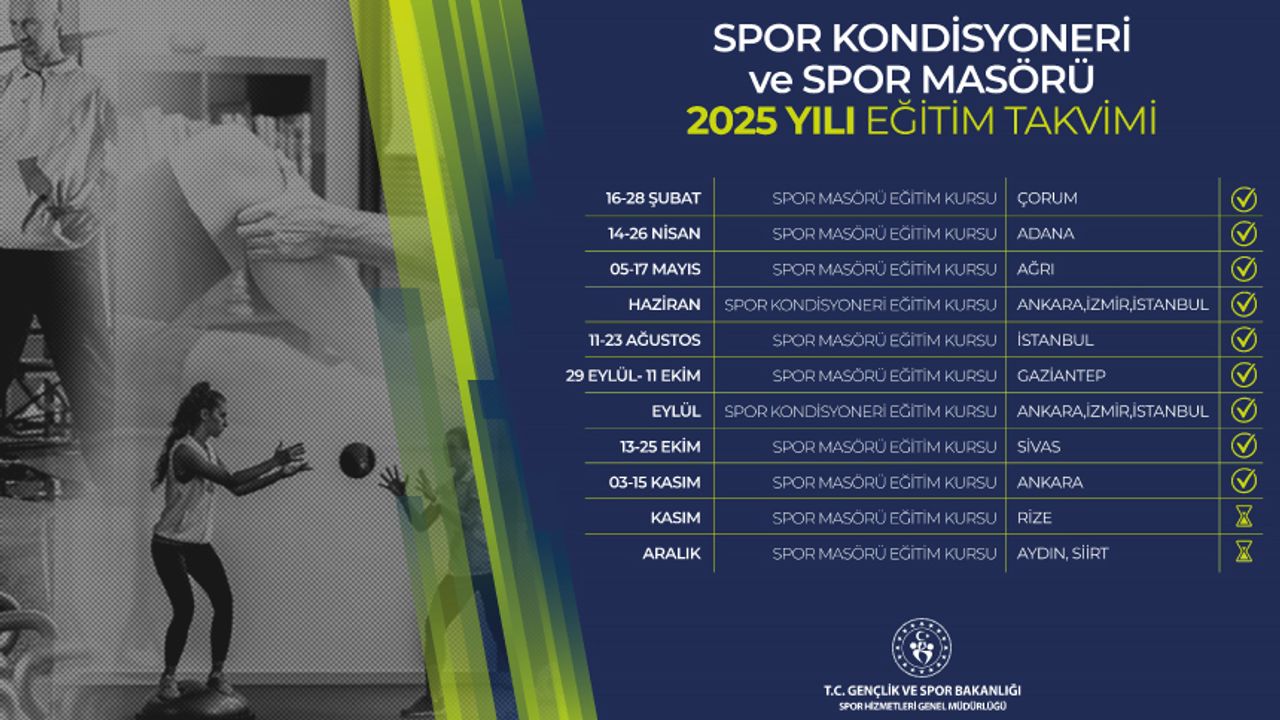 Bu kapsamda; 2025 yılında icra edilen ve açılması planlanan Spor Masörü ve Spor Kondisyoneri Eğitim Kursları yıllık faaliyet takvimi ilan edilmiştir. Belirtilen tarih ve illerde eğitim kurslarının açılması planlanmaktadır.