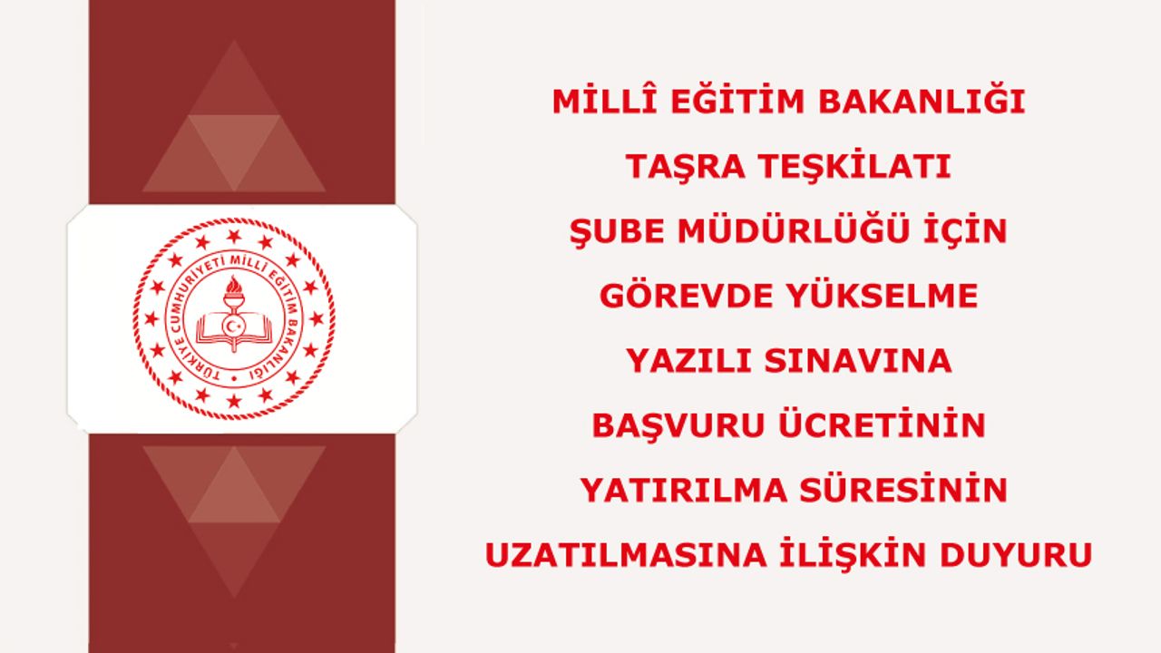 Millî Eğitim Bakanlığı taşra teşkilatı şube müdürlüğü kadrolarına atama için 7 Şubat 2026 tarihinde gerçekleştirilecek görevde yükselme yazılı sınavına başvuru ücreti 12.01.2026-13.01.2026 (saat 23.59'a kadar) tarihleri arasında yatırılabilecektir.