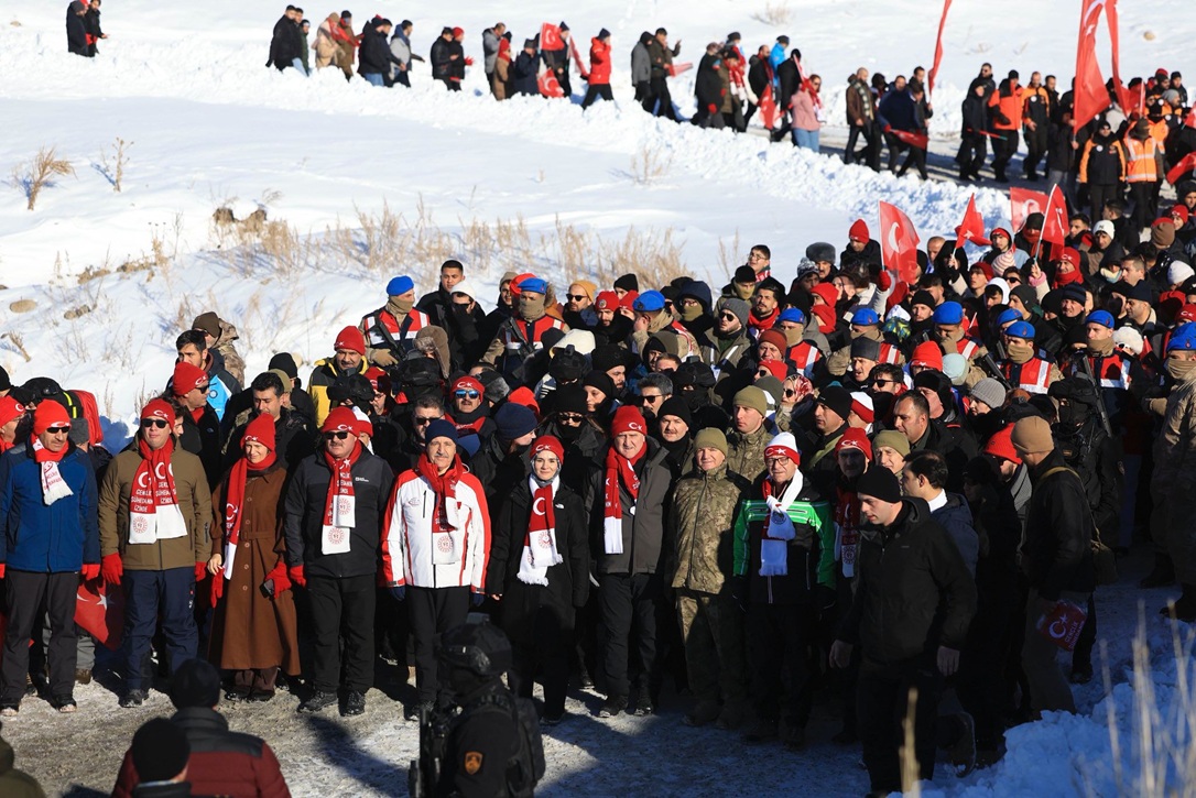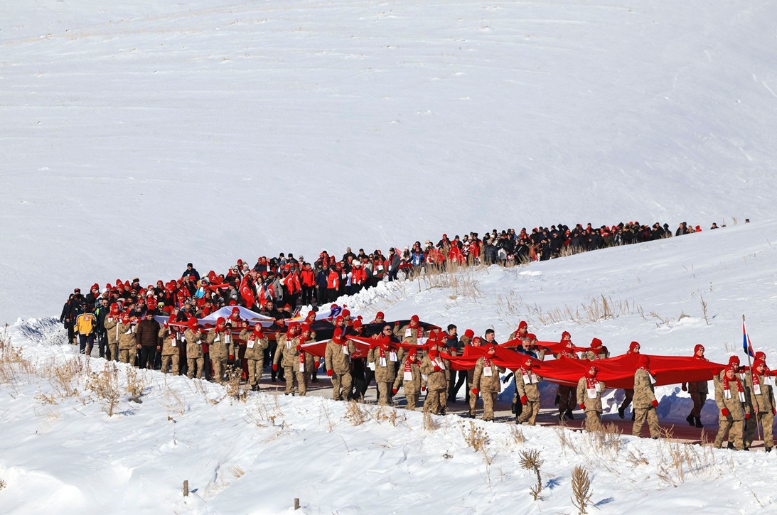 111 yıl önce Sarıkamış’ta yaşanan büyük fedakârlığı anmak için düzenlenen yürüyüşte, katılımcılar Türk bayraklarıyla karlar içinde yürüdü. Eksi 17 dereceye varan soğuk havaya rağmen gençler ve vatandaşlar, Kur’an-ı Kerim tilaveti ve duaların ardından Ay-Yıldızlı Tören Alanı’na doğru yürüyüşe geçti. Yürüyüş boyunca 100 metre uzunluğundaki Türk bayrağı taşındı.