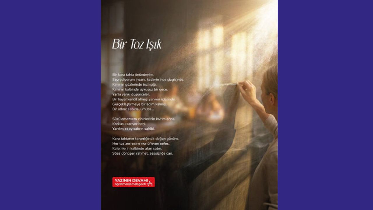 Suna POLAT’tan “Bir Toz Işık” şiiri ÖğretmenİZ dergisinde! Bir kara tahtanın önünde insanla kaderin kesiştiği o ince çizgide bir ışık beliriyor. “Bir Toz Işık”; öğretmenin sabrını, kelimelerle yeşeren umutları, her silinişte yeniden başlayan bir inancı şiirin ince diliyle okura sunuyor. Tebeşirin beyazlığıyla çoğalan ışık, kalpten kalbe uzanan görünmez bir köprüye dönüşüyor. Okumak için http://meb.ai/U3CEsot Sen de kaleminle iz bırak! Şiirlerinle ÖğretmenİZ dergisinde yer al! http://meb.ai/9giDiI#ÖğretmenİZ