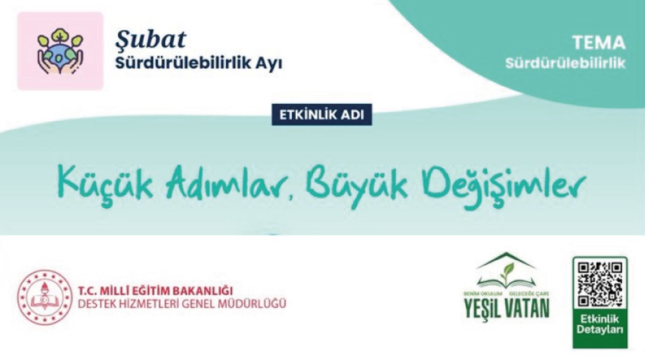 Sürdürülebilirlik Ayı Etkinliği: “Küçük Adımlar, Büyük Değişimler” Yeşil Vatan - Benim Okulum Geleceğe ÇARE etkinlikleri kapsamında ilkokul öğrencilerimiz için hazırladığımız bu çalışma ile; öğrencilerimiz, sürdürülebilir yaşam alışkanlıklarını ve dünyamıza etkilerini fark ediyor. Etkinliğin detaylarına ve daha fazlasına link üzerinden ulaşabilirsiniz: http://meb.ai/bHopxd Çalışmalarınızı tamamladıktan sonra #YeşilVatanSürdürülebilirlik ve #SürdürülebilirlikMaratonu etiketleriyle paylaşmayı unutmayın.