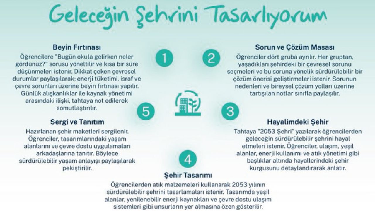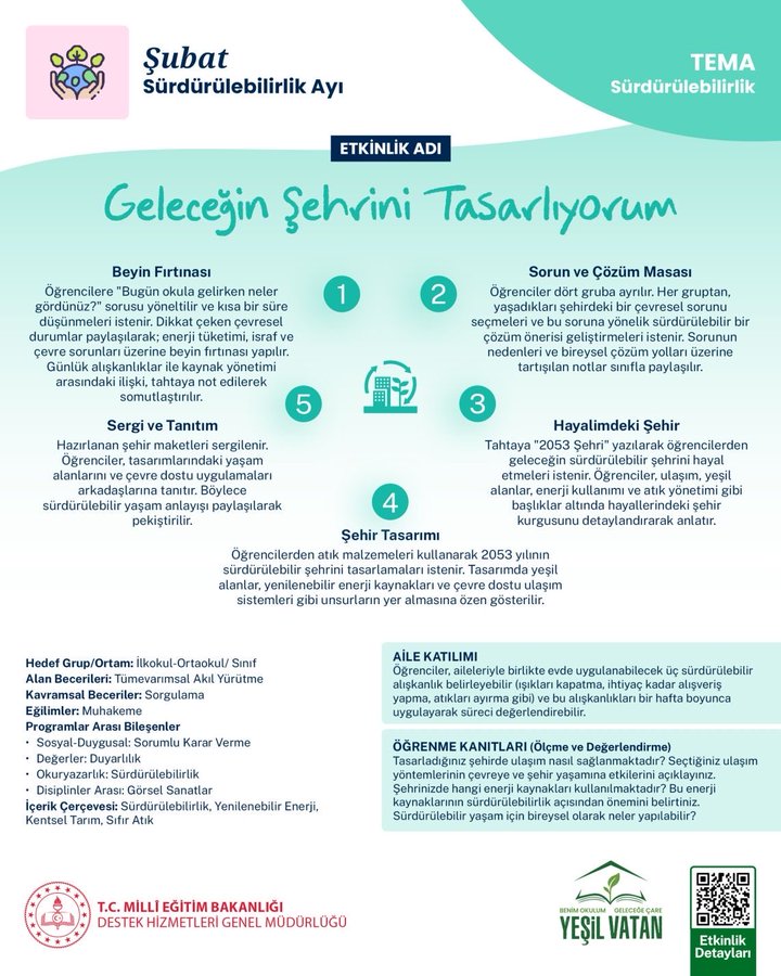 Yeşil Vatan - Benim Okulum Geleceğe ÇARE etkinlikleri kapsamında ilkokul ve ortaokul öğrencilerimiz için hazırlanan bu çalışmada öğrencilerimiz, çevresel sorunlara çözüm üretmenin, kaynakları verimli kullanmanın ve doğa dostu yaşam alanları oluşturmanın dünyamıza etkilerini fark ediyor, geleceğin sürdürülebilir şehirlerini tasarlıyorlar.
