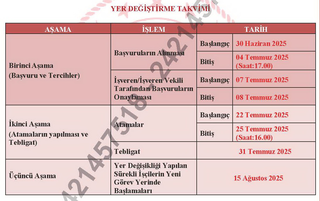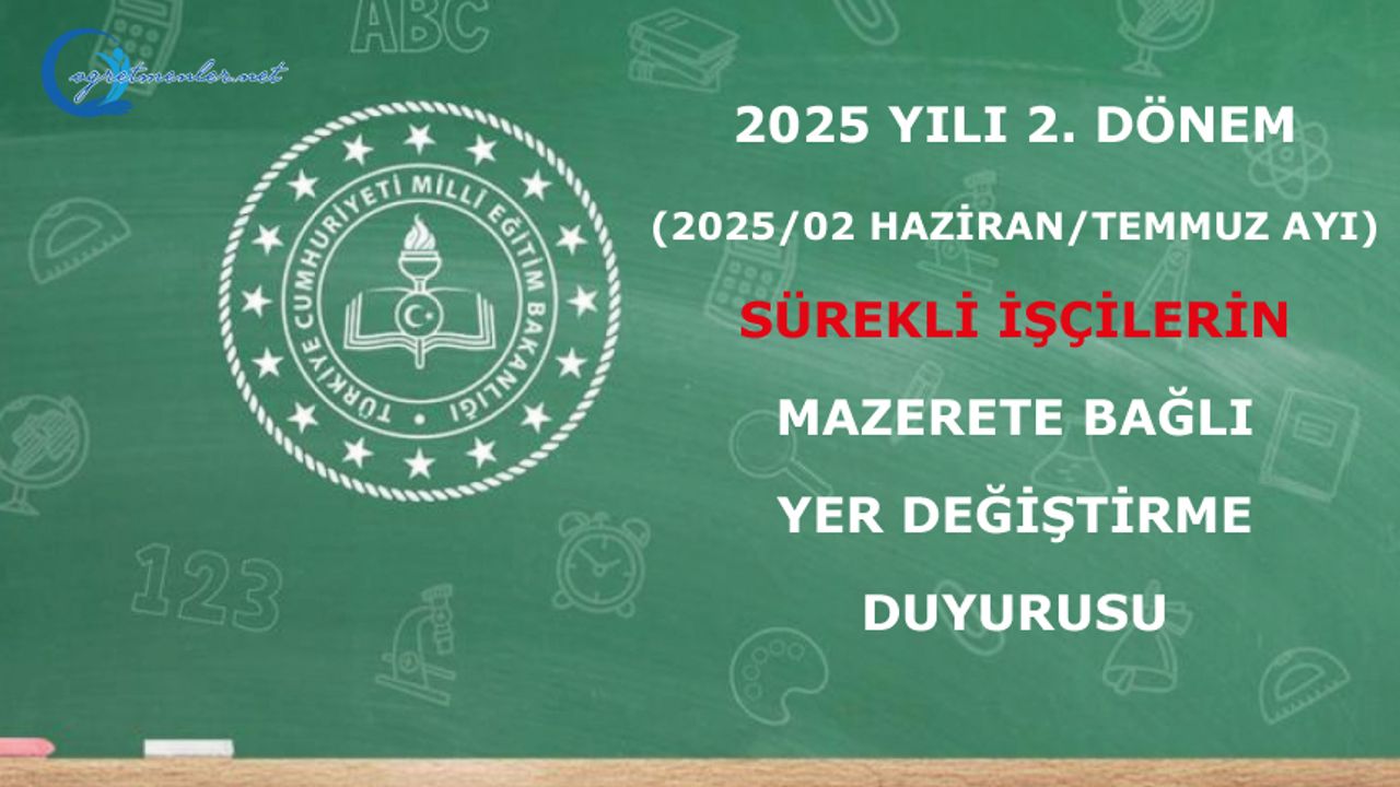 2025 YILI 2. DÖNEM (2025/02 HAZİRAN/TEMMUZ AYI) SÜREKLİ İŞÇİLERİN MAZERETE BAĞLI YER DEĞİŞTİRME DUYURUSU