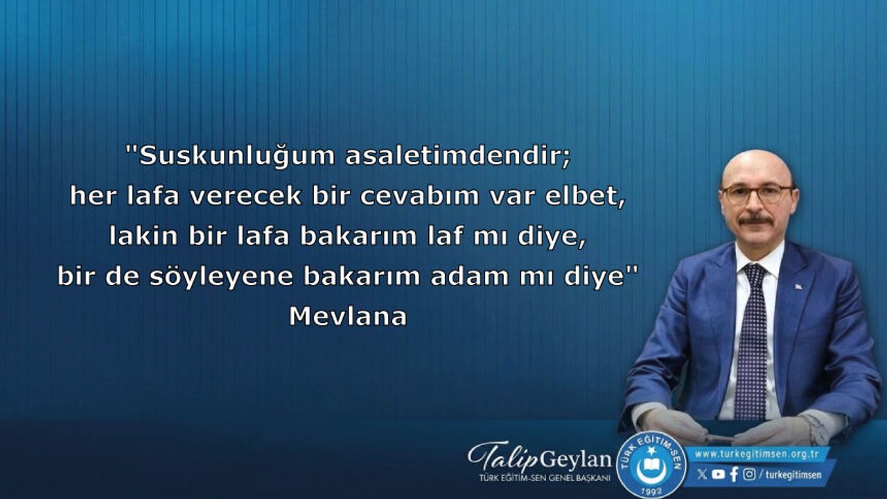 "Suskunluğum asaletimdendir; her lafa verecek bir cevabım var elbet, lakin bir lafa bakarım laf mı diye, bir de söyleyene bakarım adam mı diye" Mevlana