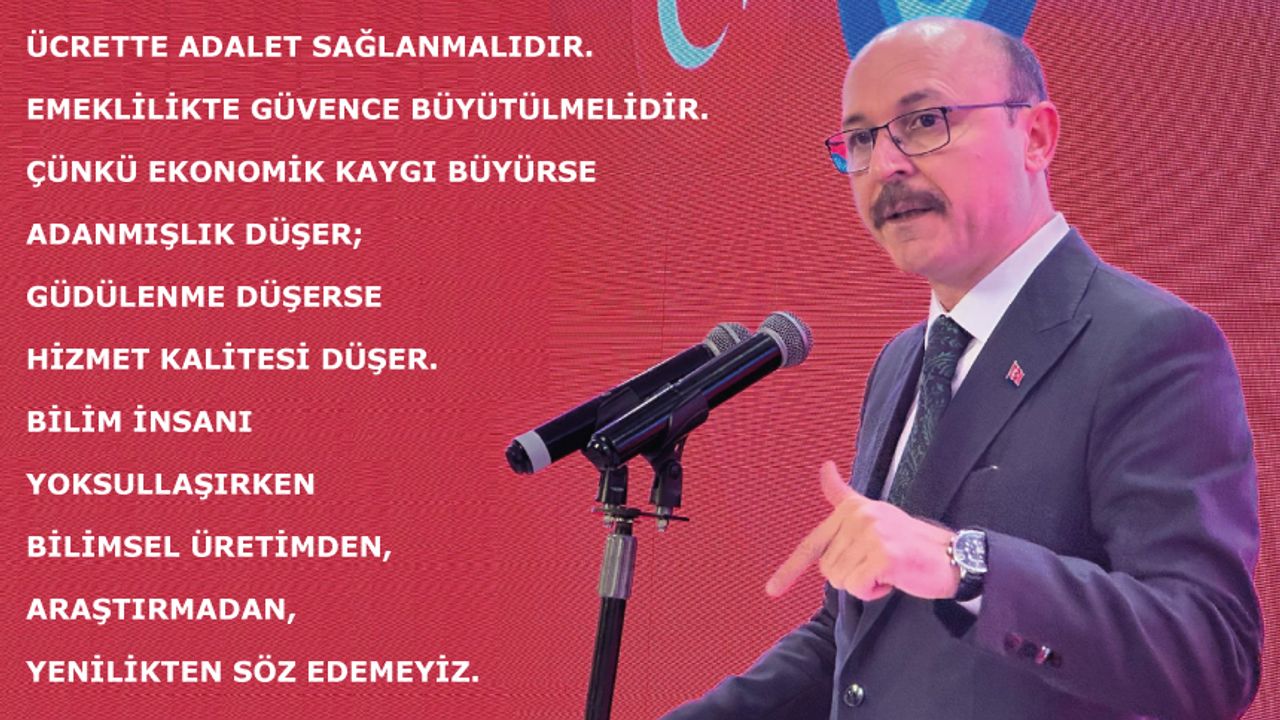 Özellikle sözleşmeliler ve üniversite çalışanlarımız açısından bir başka hayati konu, yer değişikliği ve aile birliğidir. İnsan hayatı sadece işten ibaret değildir. Özellikle aile yılında aile birliği, sağlık mazereti, can güvenliği gibi gerekçeler karşısında personeli çaresiz bırakan düzenler sürdürülemez. Şeffaf kriterler, takvimli uygulamalar, hakkaniyetli çözümler hayata geçirilmelidir. Akademisyenlerimizin emeği de güçlendirilmelidir. Bilim insanı yoksullaşırken bilimsel üretimden, araştırmadan, yenilikten söz edemeyiz. Unutulmamalıdır ki, genç akademisyenlerin gelecek kaygısını azaltmak, bilimsel destekleri artırmak, akademik emeği korumak; Türkiye’nin rekabet gücünü korumaktır.