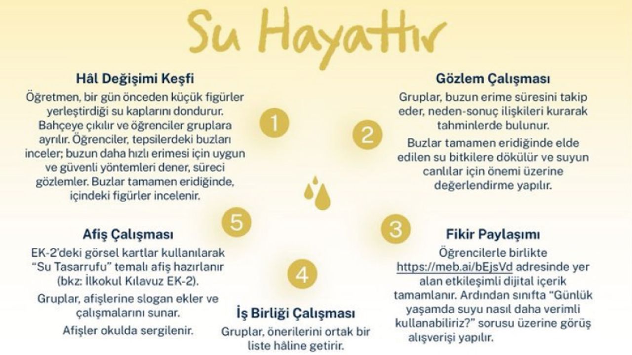 Yeşil Vatan - Benim Okulum Geleceğe ÇARE etkinlikleri kapsamında ilkokul öğrencileri için hazırladığımız bu çalışmada; çocuklarımız suyun döngüsünü ve hâl değişimini keşfediyor, suyun canlılar için önemini gözlemliyor, su verimliliğine yönelik çözüm önerileri geliştiriyor ve “Su Tasarrufu” temalı afişlerini hazırlıyorlar.