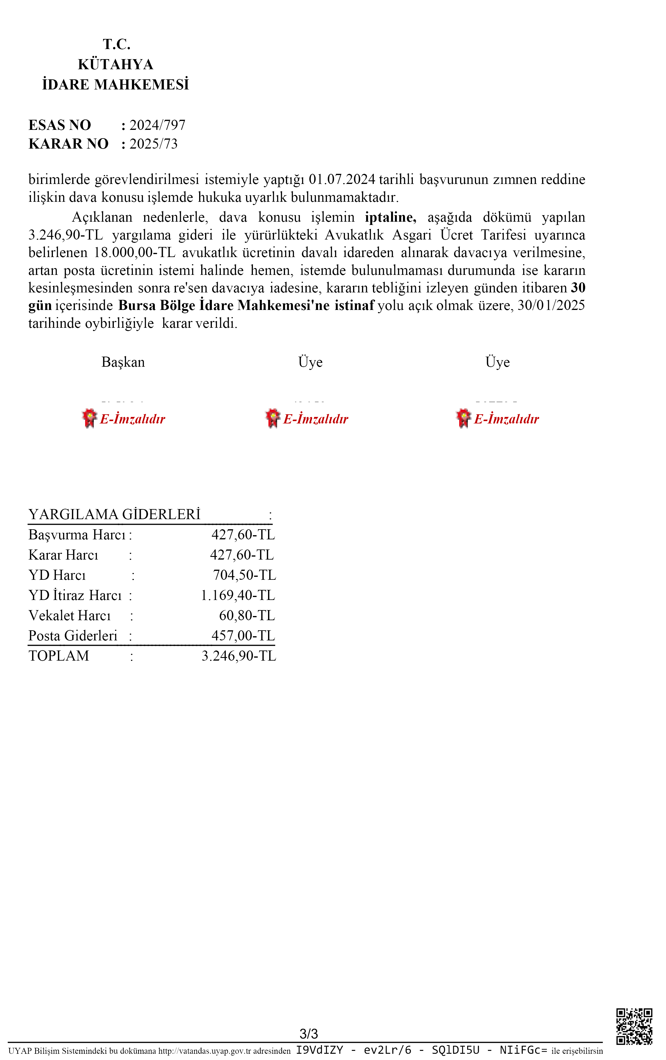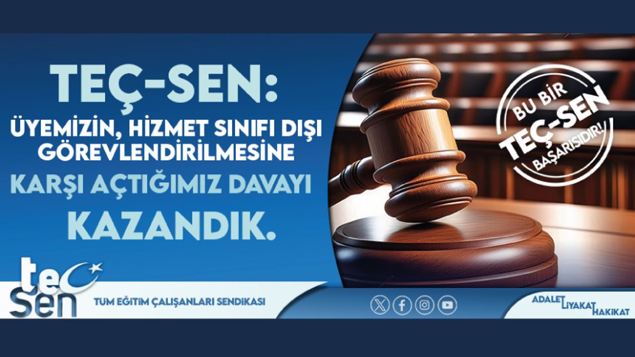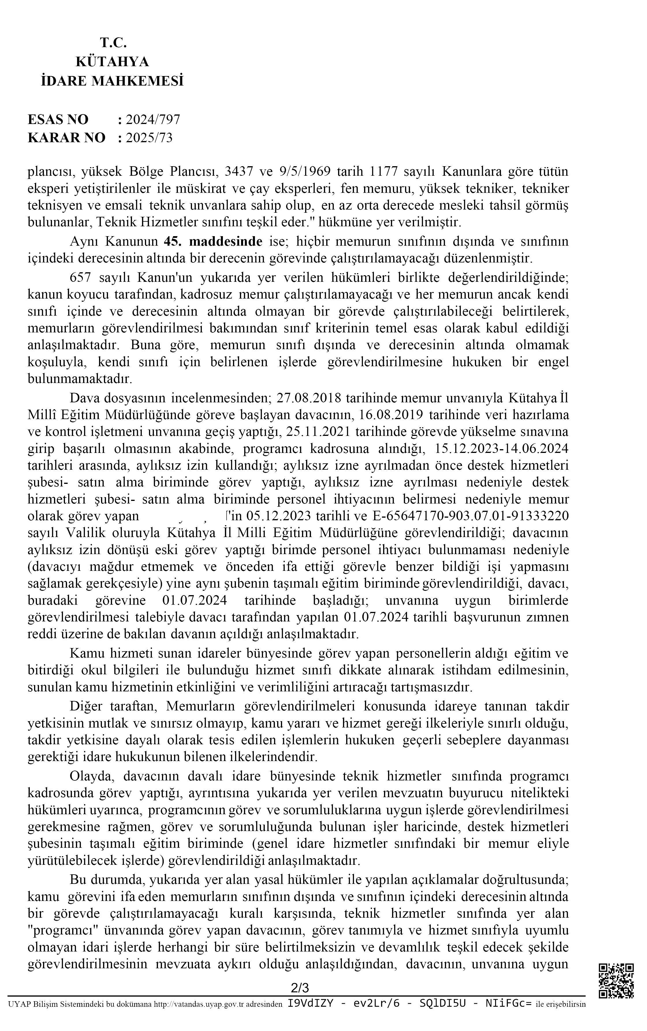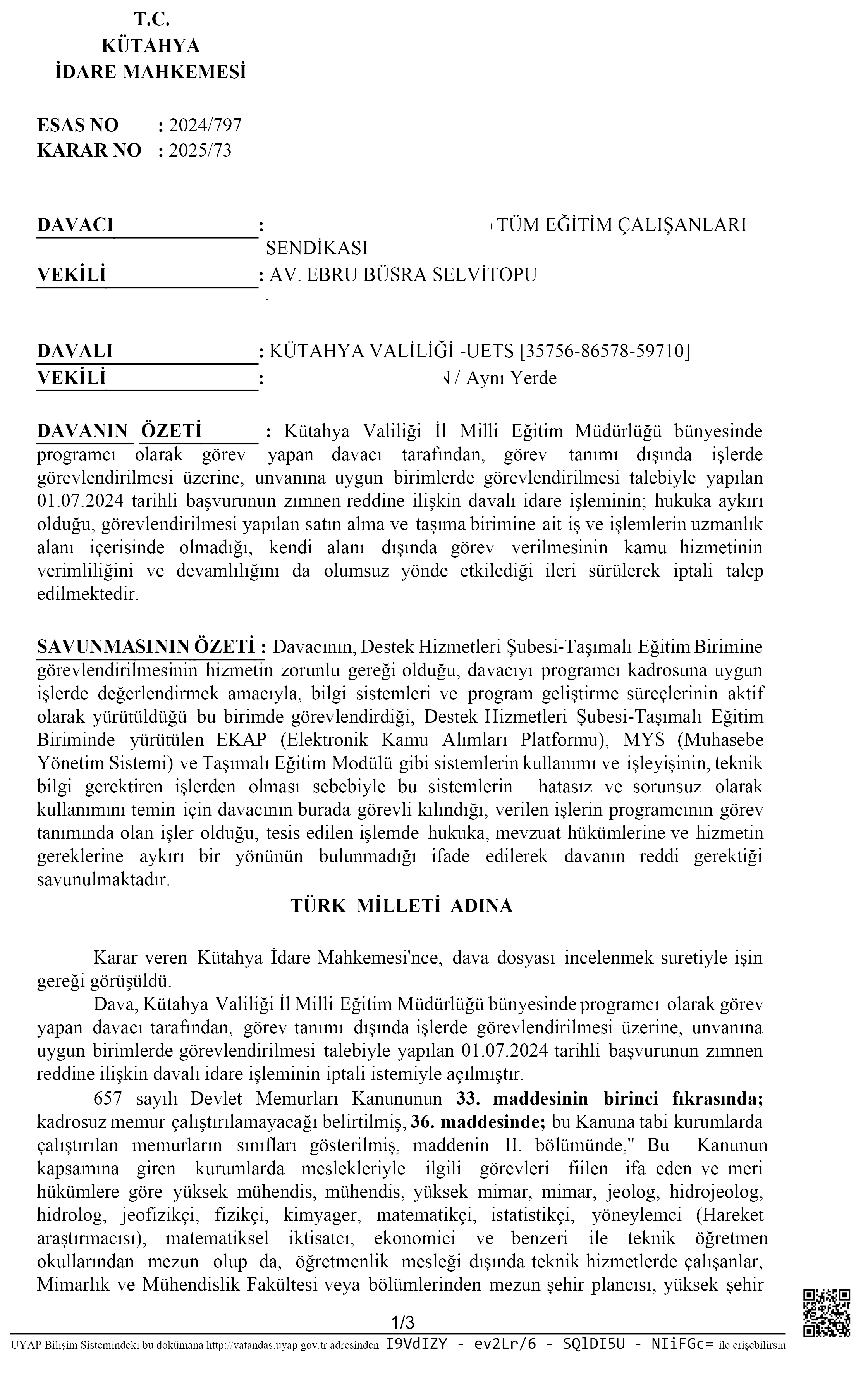 Kütahya İdare Mahkemesi 2024/797 esas ve 2025/73 sayılı kararıyla; teknik hizmetler sınıfında yer alan ve programcı unvanıyla görev yapan üyemizin, genel idare hizmetleri sınıfına ait işler kapsamında görevlendirilmesinin hukuka aykırı olduğuna hükmetmiş ve söz konusu idari işlemi iptal etmiştir.